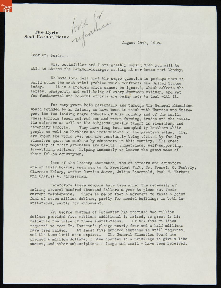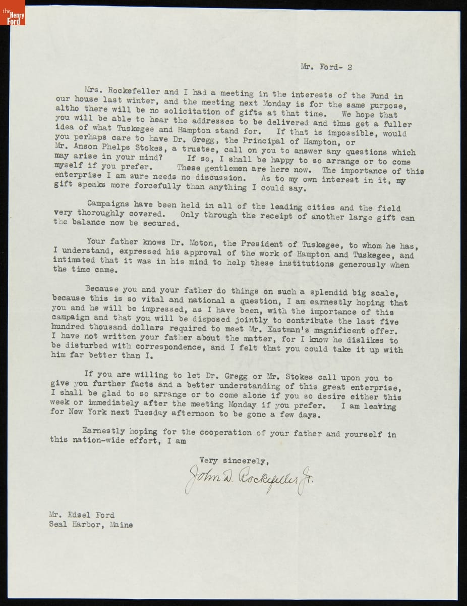 Letter to Edsel Ford from John D. Rockefeller Jr. Urging Support For the Hampton-Tuskegee Endowment, August 18, 1925