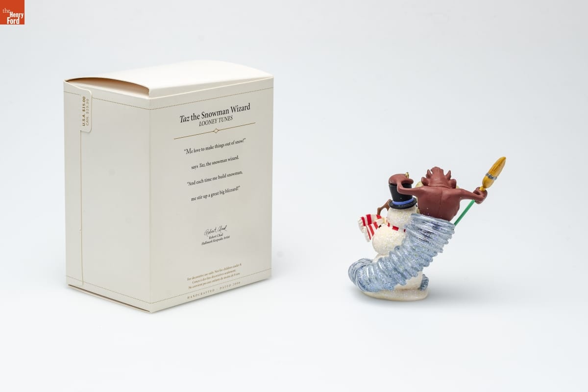 Taz the Snowman Wizard / LOONEY TUNES / "Me love to make things out of snow!" / says Taz, the snowman wizard. / "And each time me build snowman, / me stir up a great big blizzard!" / Robert Chad / Hallmark Keepsake Artist / For decorative use only. Not for children under 8. / Concu a des fins decoratives seulement. / Ne convient pas aux enfants de moins de 8 ans. / HANDCRAFTED - DATED 2006