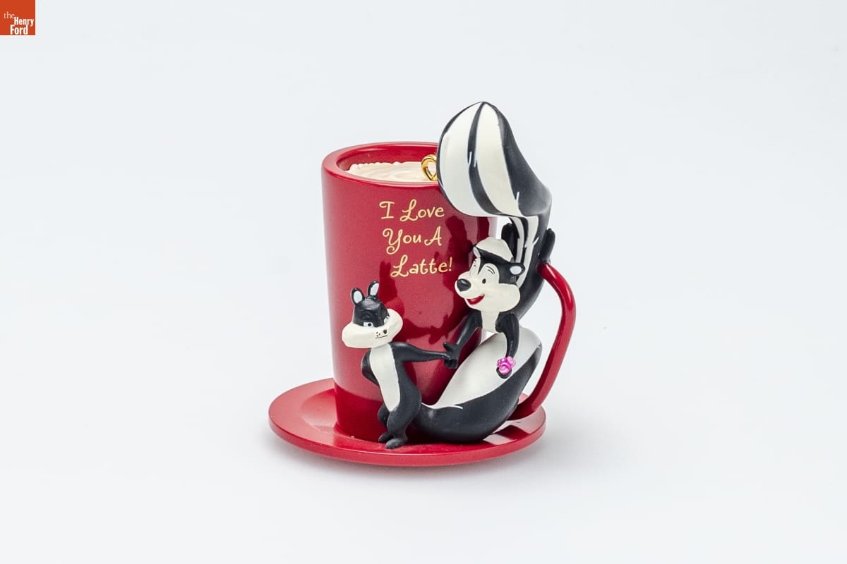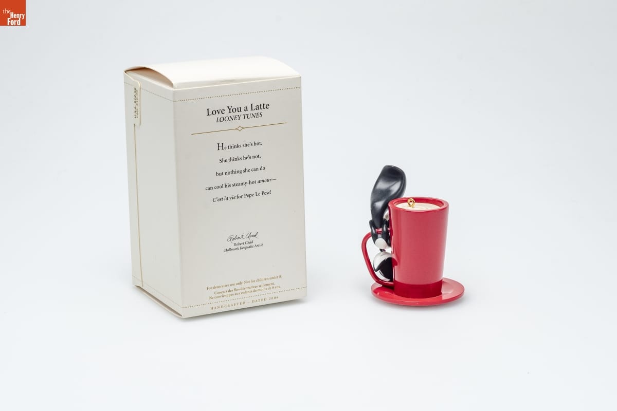 Love You a Latte / LOONEY TUNES / He thinks she's hot, / She thinks he's not, / but nothing she can do / can cool his steamy-hot amour-- / C'est la vie for Pepe Le Pew! / Robert Chad / Hallmark Keepsake Artist / For decorative use only. Not for children under 8. / Concu a des fins decoratives seulement. / Ne convient pas aux enfants de moins de 8 ans. / HANDCRAFTED - DATED 2006