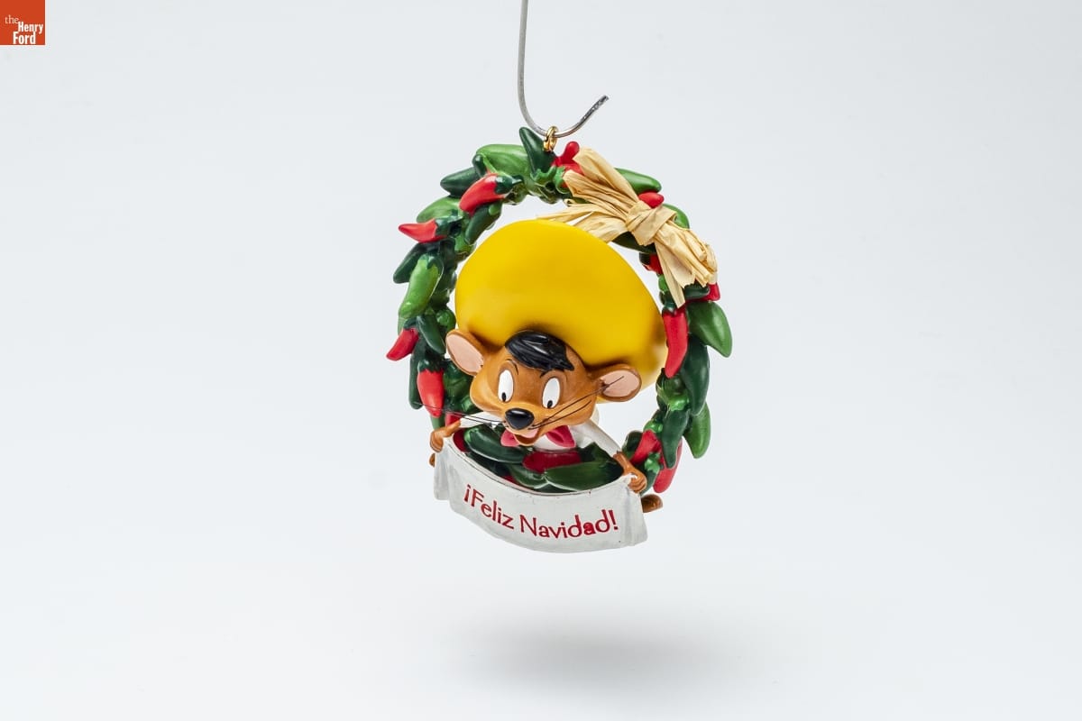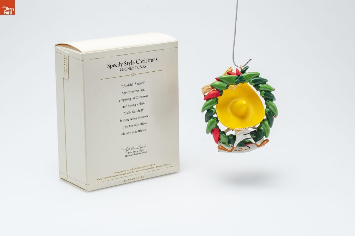 Speedy Style Christmas / LOONEY TUNES / "Andale! Andale!" / Speedy moves fast, / preparing for Christmas / and having a blast. / "Feliz Navidad!" / is the greeting he sends to his buenos amigos / (his very good friends). / Anita Marra Rogers / Hallmark Keepsake Artist / For decorative use only. Not for children under 8. / Concu a des fins decoratives seulement. Ne convient pas aux enfants de moins de 8 ans. / HANDCRAFTED