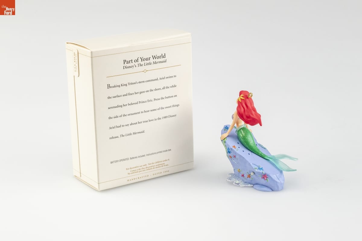Part of Your World / Disney's The Little Mermaid / Breaking King Triton's stern command, Ariel swims to / the surface and fixes her gaze on the shore, all the while / serenading her beloved Prince Eric. Press the button on / the side of the ornament to hear some of the sweet things / Ariel had to say about her true love in the 1989 Disney / release, The Little Mermaid. / BATTERY-OPERATED. Batteries included. Instructions printed inside box. / For decorative use only. Not for children under 8. / Concu a des fins decoratives seulement. / Ne convient pas aux enfants de moins de 8 ans. / HANDCRAFTED - DATED 2006