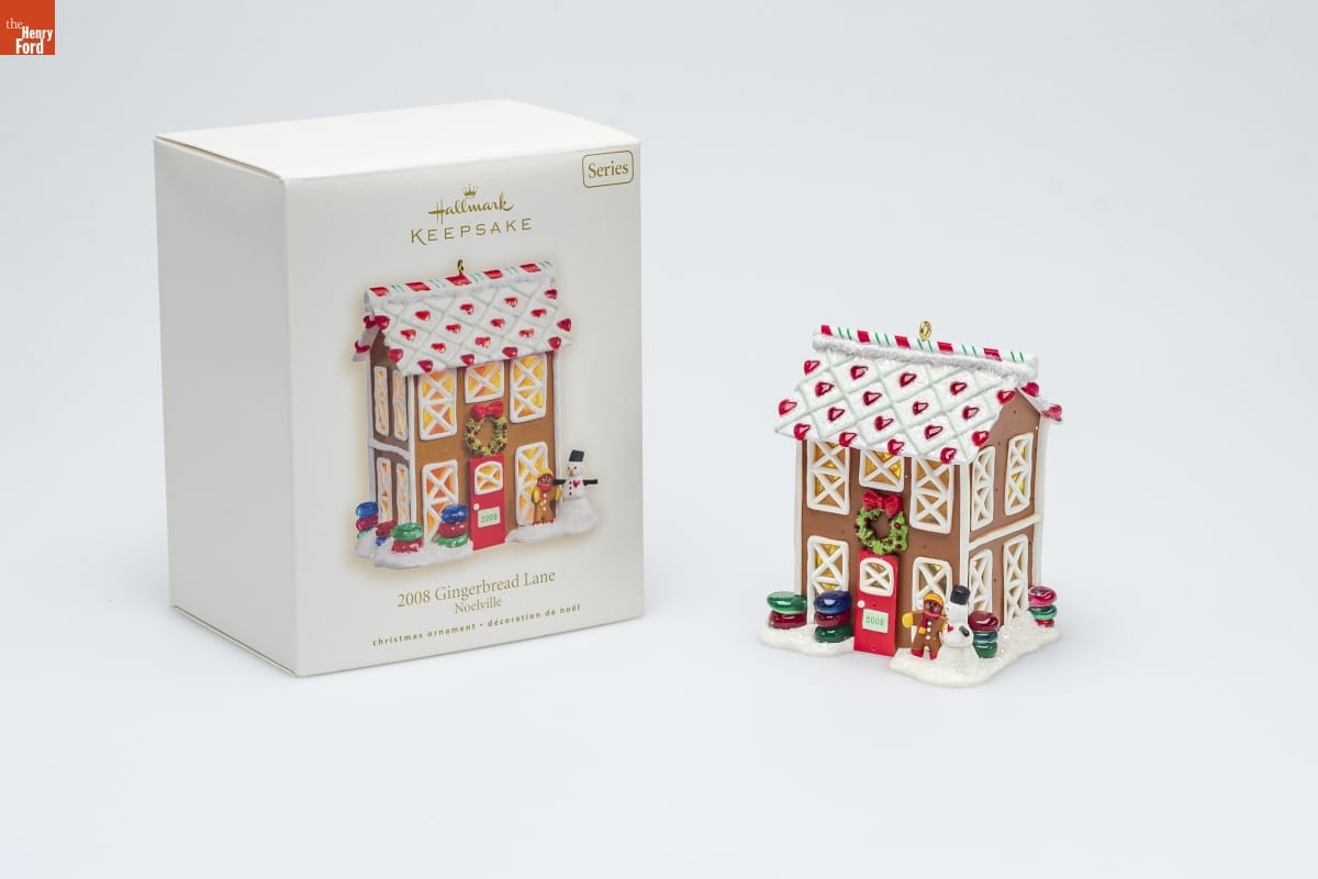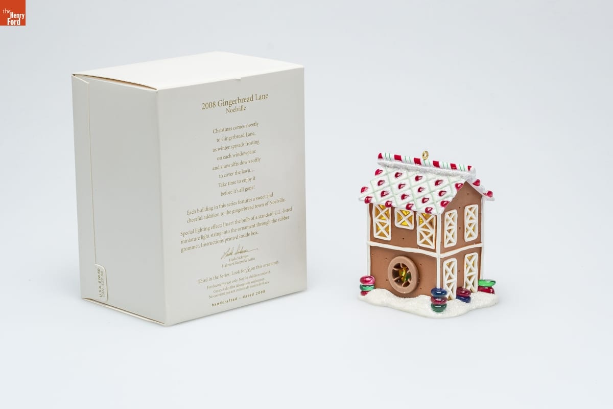 2008 Gingerbread Lane / Noelville / Christmas comes sweetly / to Gingerbread Lane, / as winter spreads frosting / on each windowpane / and snow sifts down softly / to cover the lawn... / Take time to enjoy it / before it's all gone! / Each building in this series features a sweet and / cheerful addition to the gingerbread town of Noelville. / Special lighting effect: Insert the bulb of a standard U.L.-listed / miniature light string into the ornament through the rubber / grommet. Instructions printed inside the box. / Linda Sickman / Hallmark Keepsake Artist / Third in the Series. Look for 3 on this ornament. / For decorative use only. Not for children under 8. / Concu a des fins decoratives seulement. / Ne convient pas aux enfants de moins de 8 ans. / handcrafted - dated 2008