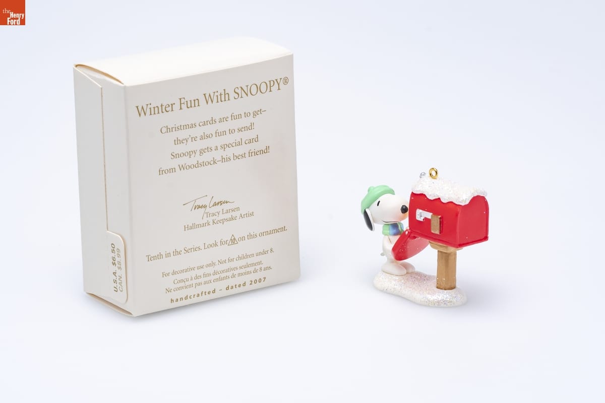 Winter Fun With SNOOPY(R) / Christmas cards are fun to get- / they're also fun to send! / Snoopy gets a special card / from Woodstock-his best friend! / Tracy Larsen / Hallmark Keepsake Artist / Tenth in the Series. Look for 10 on this ornament. / For decorative use only. Not for children under 8. / Concu a des fins decoratives seulement. / Ne convient pas aux enfants de moins de 8 ans. / handcrafted - dated 2007