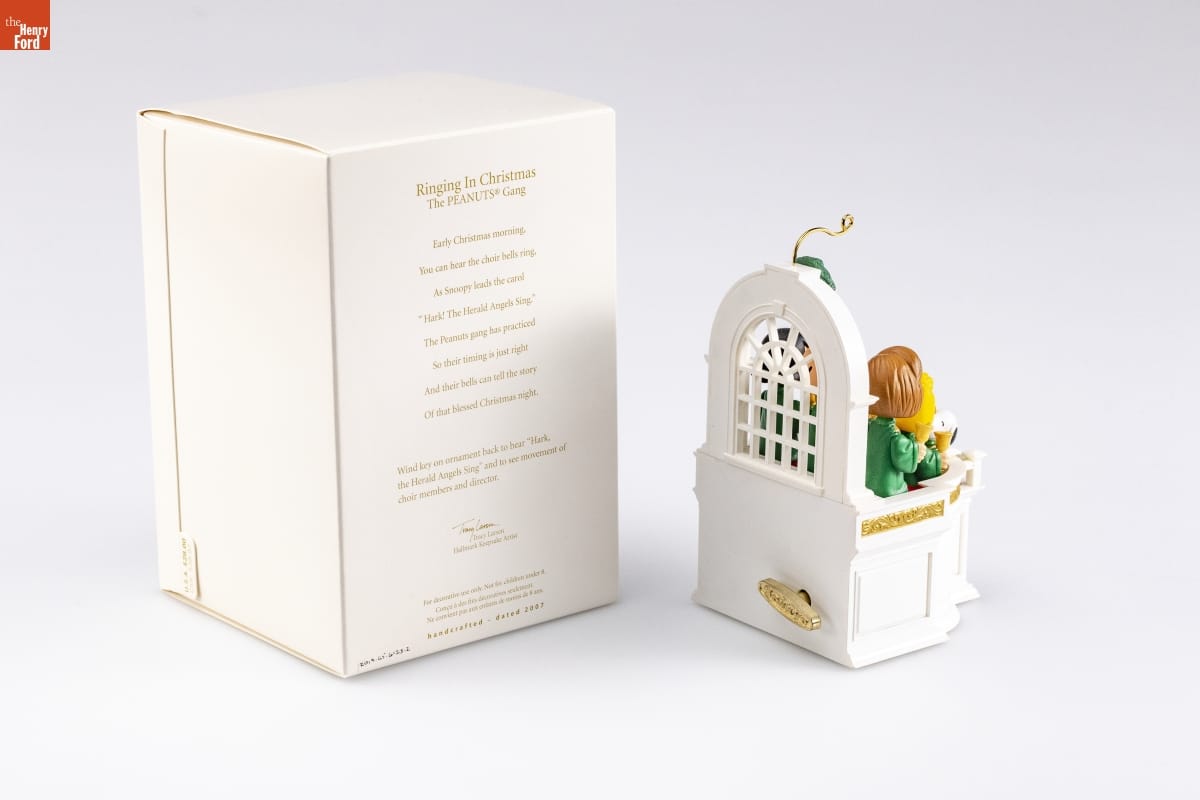 Ringing In Christmas / The PEANUTS [R] Gang / Early Christmas morning, / You can hear the choir bells ring, / As Snoopy leads the carol / "Hark! The Herald Angels Sing." / The Peanuts gang has practiced / So their timing is just right / And their bells can tell the story / Of that blessed Christmas night. / Wind key on ornament back to hear "Hark, / the Herald Angels Sing" and to see movement of / choir members and director. / Tracy Larsen / Hallmark Keepsake Artist / For decorative use only. Not for children under 8. / Concu a des fins decoratives seulement. / Ne convient pas aux enfants de moins de 8 ans. / handcrafted - dated 2007