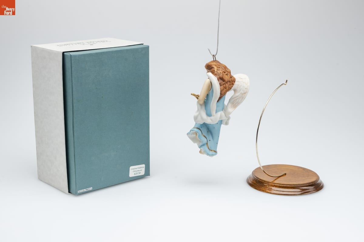 Designed by Donna Lee of Hallmark Cards, Inc. in Kansas City, Missouri. Ornament and display stand made in Taiwan, hanger made in Hong Kong.