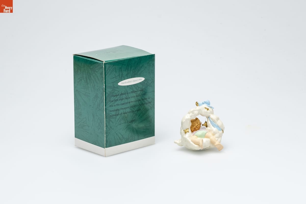 Handcrafted - Dated 1994 / Happily afloat on a billowy cloud, / this little angel has a shiny brass halo. / She is the creation of Donna Lee, known to / Keepsake Ornament collectors fo her playful / portrayals of mischievous angels.