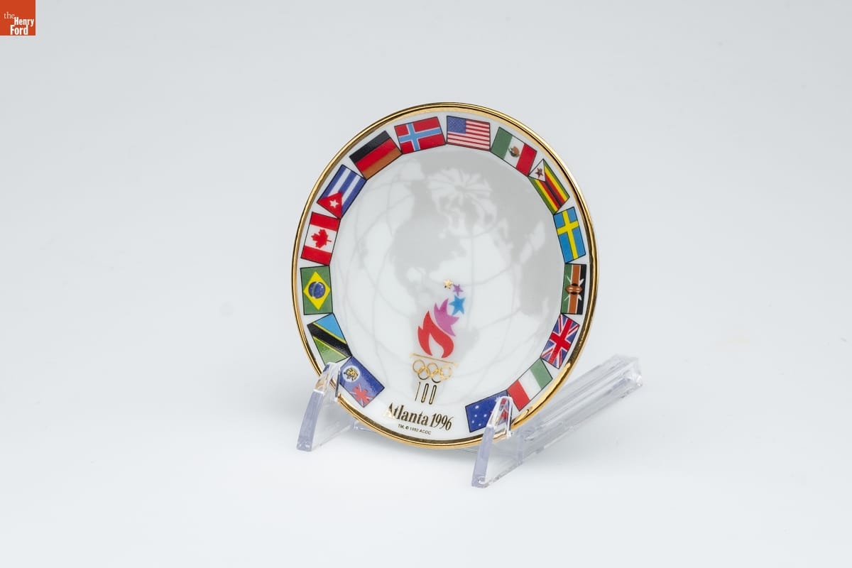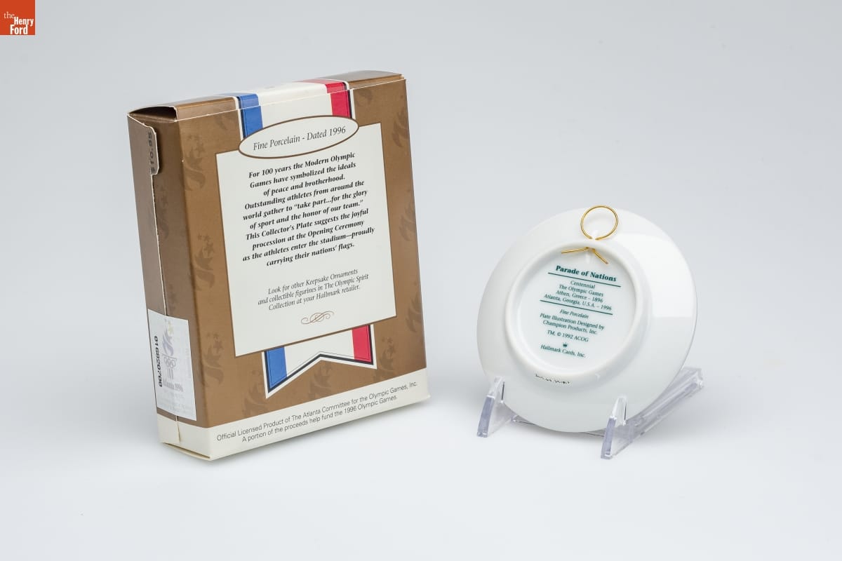 Fine Porcelain - Dated 1996 / For 100 years the Modern Olympic / Games have symbolized the ideals / of peace and brotherhood. / Outstanding athletes from around the / world gather to "take part...for the glory / of sport and the honor of our team." / This Collector's Plate suggests the joyful / procession at the Opening Ceremony / as the athletes enter the stadium--proudly / carrying their nations' flags. / Look for other Keepsake Ornaments / and collectible figurines in The Olympic Spirit / Collection at your Hallmark retailer. / Official Licensed Product of The Atlanta Committee for the Olympic Games, Inc. / A portion of the proceeds help fund the 1996 Olympic Games.