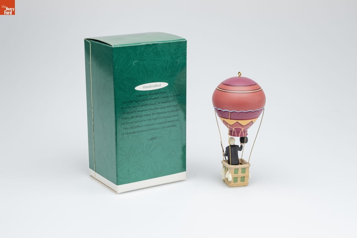 Handcrafted / Sculpted by Anita Marra Rogers / This 1996 Club Edition Ornament is based on a scene / from the motion picture classic The Wizard of Oz. TM / Sculpted by Keepsake Ornament artist Anita Marra / Rogers, the design depicts the Wizard as he sets off in / his hot-air balloon for "the land of E. Pluribus Unum." / This Club Edition Ornament is available exclusively / to Keepsake Ornament Collector's Club members.