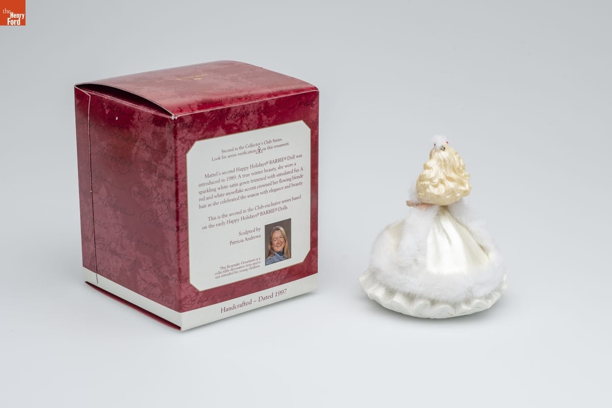 Second in the Collector's Club Series / Look for series verification 2 on this ornament. / Mattel's second Happy Holidays(R) BARBIE(R) Doll was / introduced in 1989. A true winter beauty, she wore a / sparkling white satin gown trimmed with simulated fur. A / red and white snowflake accent crowned her flowing blonde / hair as she celebrated the season with elegence and beauty. / This is the second in the Club-exclusive series based / on the early Happy Holidays(R) BARBIE(R) Dolls. / Sculpted by / Patricia Andrews / This Keepsake Ornament is a / collectible decorative item and is / not intended for young children. / Handcrafted - Dated 1997