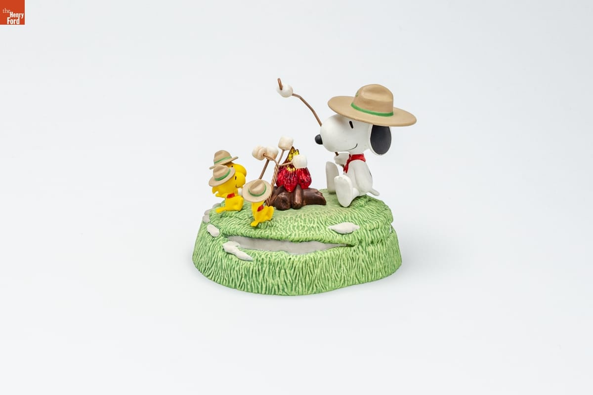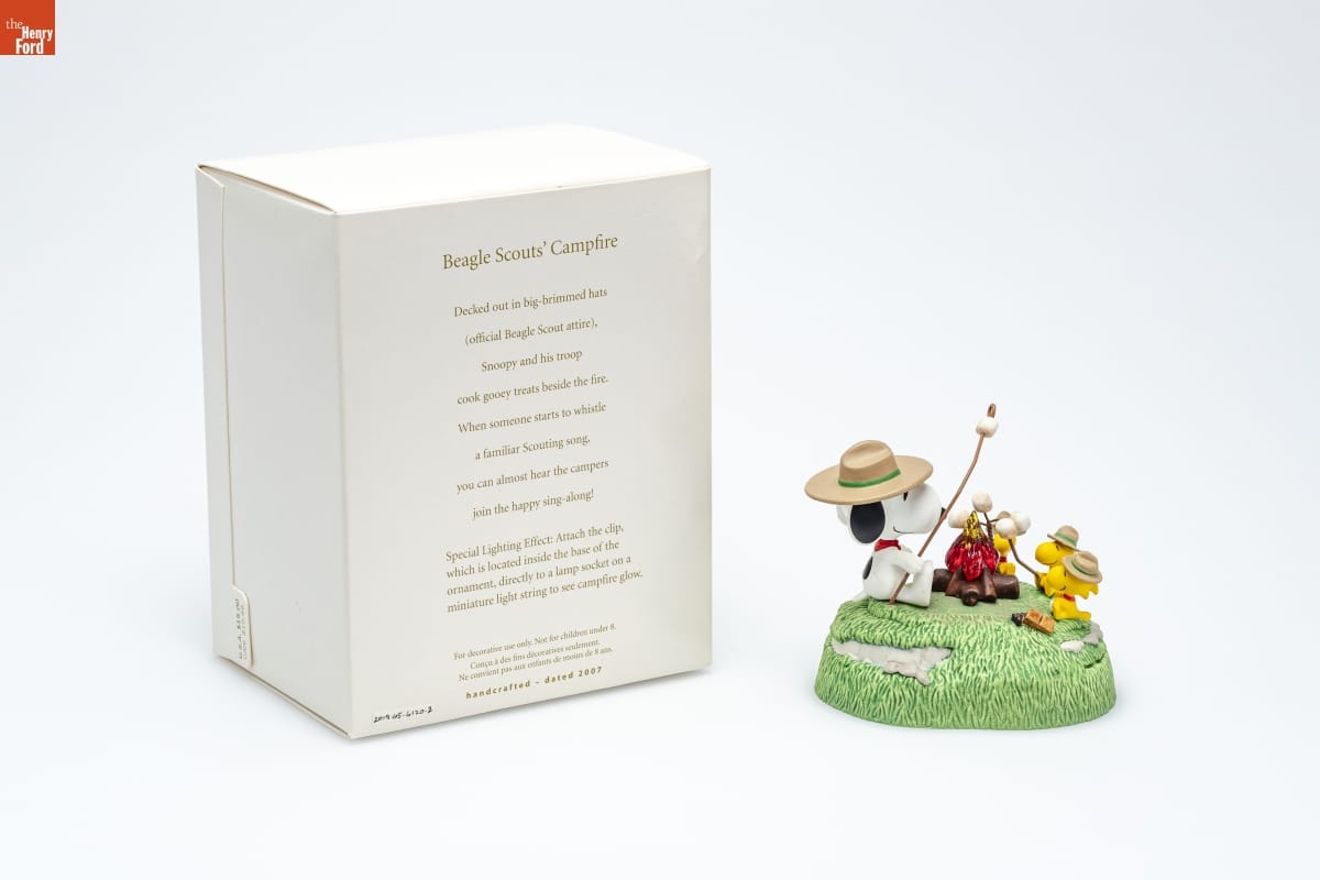 Beagle Scouts' Campfire / Decked out in big-brimmed hats / (official Beagle Scout attire), / Snoopy and his troop / cook gooey treats beside the fire. / When someone starts to whistle / a familiar Scouting song, / you can almost hear the campers / join the happy sing-along! / Special Lighting Effect: Attach the clip, / which is located inside the base of the / ornament, directly to a lamp socket on a / miniature light string to see the campfire glow. / For decorative use only. Not for children under 8. / Concu a des fins decoratives seulement. / Ne convient pas aux enfants de moins de 8 ans. / handcrafted - dated 2007