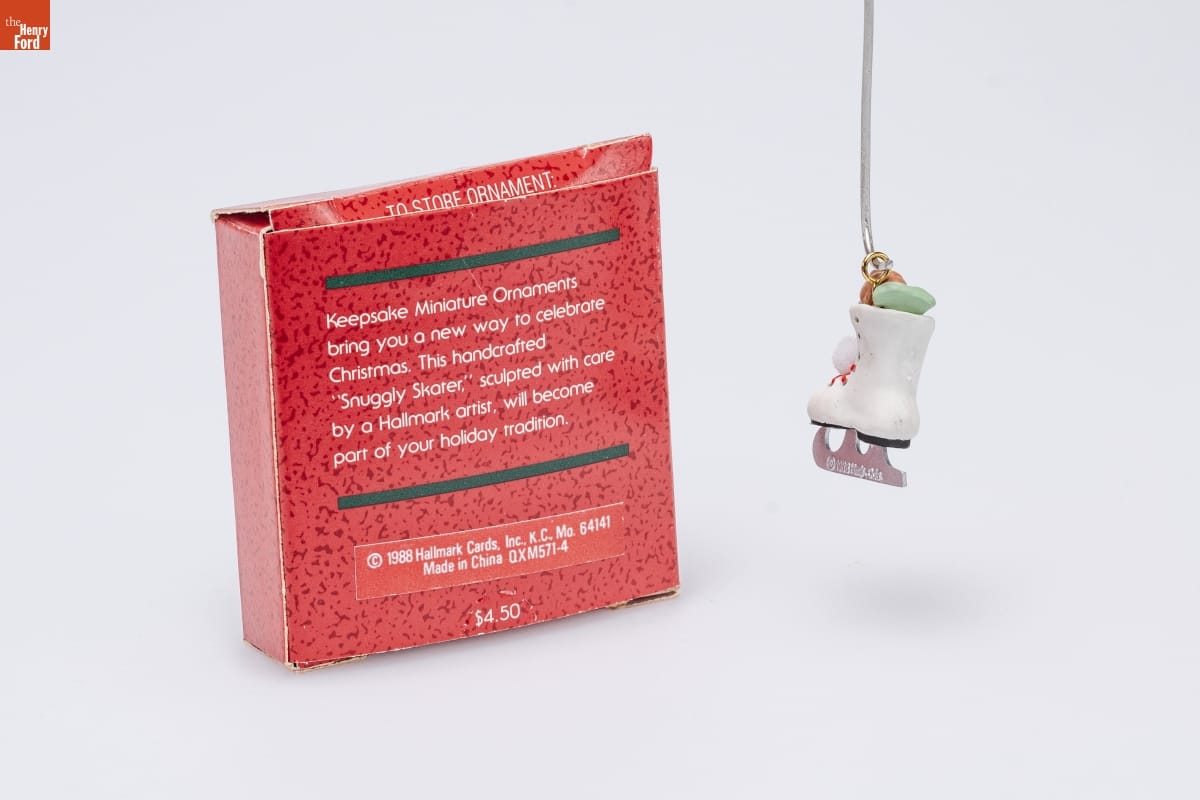 Keepsake Miniature Ornaments / bring you a new way to celebrate / Christmas. This handcrafted / "Snuggly Skater," sculpted with care / by a Hallmark artist, will become / part of your holiday tradition. / (C) 1988 Hallmark Cards, Inc., K.C., Mo. 64141 / Made in China QXM571-4