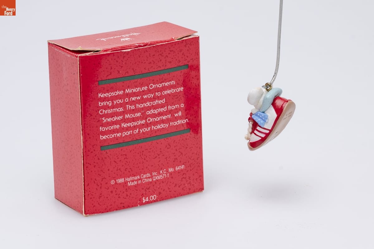 Keepsake Miniature Ornaments / bring you a new way to celebrate / Christmas. This handcrafted / "Sneaker Mouse," adapted from a / favorite Keepsake Ornament, will / become part of your holiday tradition. / (C) 1988 Hallmark Cards, Inc., K.C., Mo. 64141 / Made in China QXM571-1