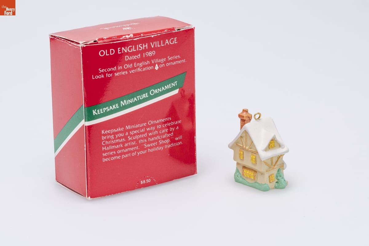 OLD ENGLISH VILLAGE / Dated 1989 / Second in Old English Village Series. / Look for series verification 2 on ornament. / KEEPSAKE MINIATURE ORNAMENT / Keepsake Miniature Ornaments / bring you a special way to celebrate / Christmas. Sculpted with care by a / Hallmark artist, this handcrafted / series ornament, "Sweet Shop," will / become part of your holiday tradition.