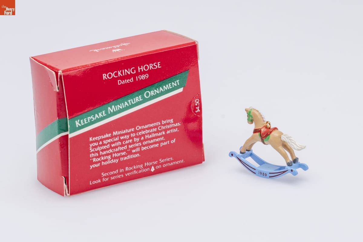 ROCKING HORSE / Dated 1989 / KEEPSAKE MINIATURE ORNAMENT / Keepsake Miniature Ornaments bring / you a special way to celebrate Christmas. / Sculpted with care by a Hallmark artist, / this handcrafted series ornament, / "Rocking Horse," will become part of / your holiday tradition. / Second in Rocking Horse Series. / Look for series verification 2 on ornament.