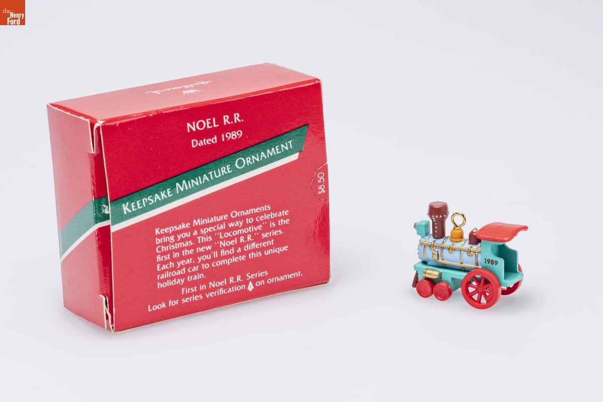 NOEL R.R. / Dated 1989 / KEEPSAKE MINIATURE ORNAMENT / Keepsake Miniature Ornaments / bring you a special way to celebrate / Christmas. This "Locomotive" is the / first in the new "Noel R.R." series. / Each year, you'll find a different / railroad car to complete this unique / holiday train. / First in Noel R.R. Series. / Look for series verification 1 on ornament.