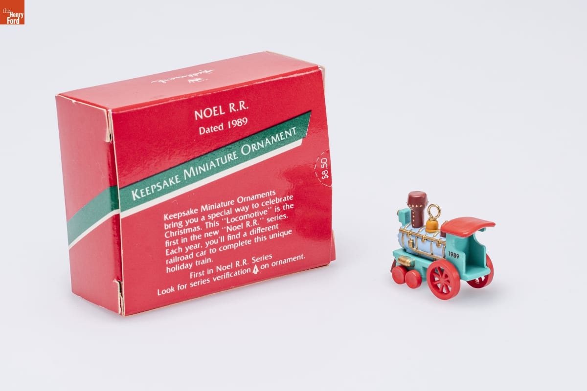 NOEL R.R. / Dated 1989 / KEEPSAKE MINIATURE ORNAMENT / Keepsake Miniature Ornaments / bring you a special way to celebrate / Christmas. This "Locomotive" is the / first in the new "Noel R.R." series. / Each year, you'll find a different / railroad car to complete this unique / holiday train. / First in Noel R.R. Series. / Look for series verification 1 on ornament.