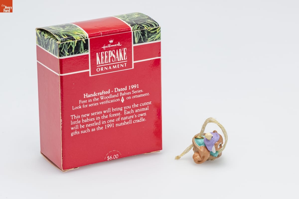 Hallmark / KEEPSAKE / ORNAMENT / Handcrafted - Dated 1991 / First in the Woodland Babies Series. / Look for series verification 1 on ornament. / This new series will bring you the cutest / little babies in the forest. Each animal / will be nestled in one of nature's own / gifts such as the 1991 nutshell cradle.