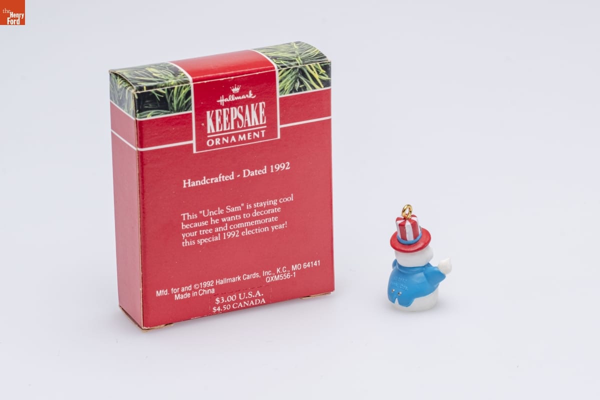Hallmark / KEEPSAKE / ORNAMENT / Handcrafted - Dated 1992 / This "Uncle Sam" is staying cool / because he wants to decorate / your tree and commemorate / this special 1992 election year! / Mfd. for and (C) 1992 Hallmark Cards, Inc., K.C., MO 64141 / Made in China QXM556-1