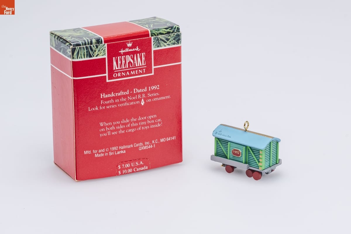 Hallmark / KEEPSAKE / ORNAMENT / Handcrafted - Dated 1992 / Fourth in the Noel R.R. Series. / Look for series verification 4 on ornament. / When you slide the door open / on both sides of this tiny box car, / you'll see the cargo of toys inside! / Mfd. for and (C) 1992 Hallmark Cards, Inc., K.C., MO 64141 / Made in Sri Lanka QXM544-1