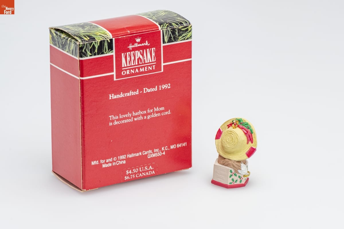 Hallmark / KEEPSAKE / ORNAMENT / Handcrafted - Dated 1992 / This lovely hatbox for Mom / is decorated with a golden cord. / Mfd. for and (C) 1992 Hallmark Cards, Inc., K.C., MO 64141 / Made in China QXM550-4