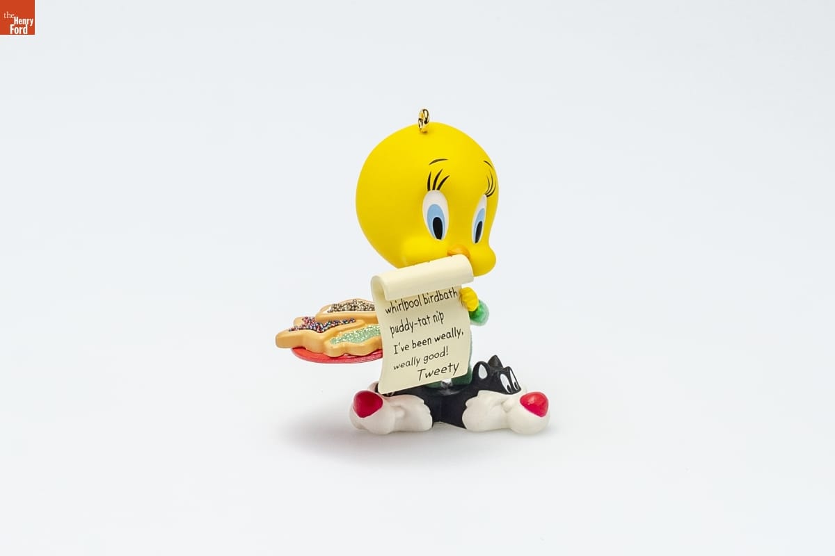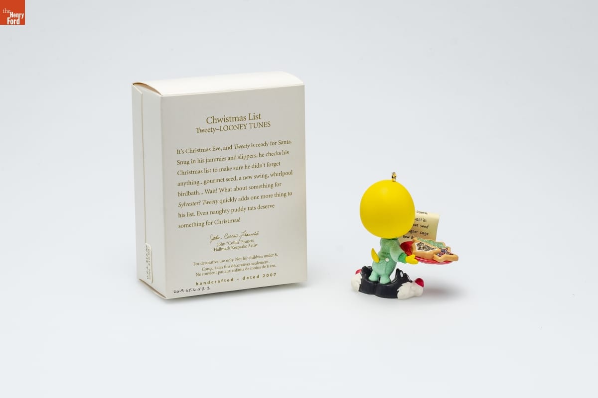 Chwistmas List / Tweety--LOONEY TUNES / It's Christmas Eve, and Tweety is ready for Santa. / Snug in his jammies and slippers, he checks his / Christmas list to make sure he didn't forget / anything...gourmet seed, a new swing, whirlpool / birdbath...Wait! What about something for / Sylvester? Tweety quickly adds one more thing to / his list. Even naughty puddy tats deserve / something for Christmas! / John "Collin" Francis / Hallmark Keepsake Artist / For decorative use only. Not for children under 8. / Concu a des fins decoratives seulement. / Ne convient pas aux enfants de moins de 8 ans. / handcrafted - dated 2007