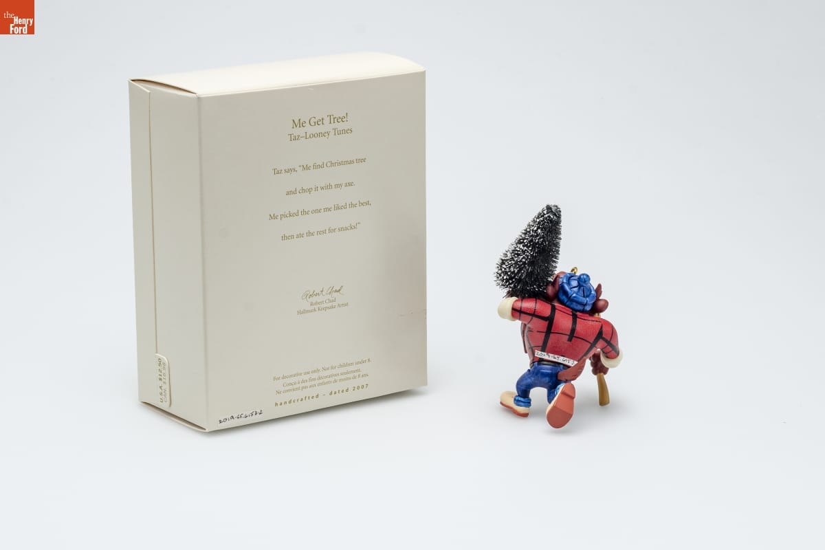 Me Get Tree! / Taz--Looney Tunes / Taz says, "Me find Christmas tree / and chop it with my axe. / Me picked the one me liked best, / then ate the rest for snacks!" / Robert Chad / Hallmark Keepsake Artist / For decorative use only. Not for children under 8. / Concu a des fins decoratives seulement. / Ne convient pas aux enfants de moins de 8 ans. / handcrafted - dated 2007