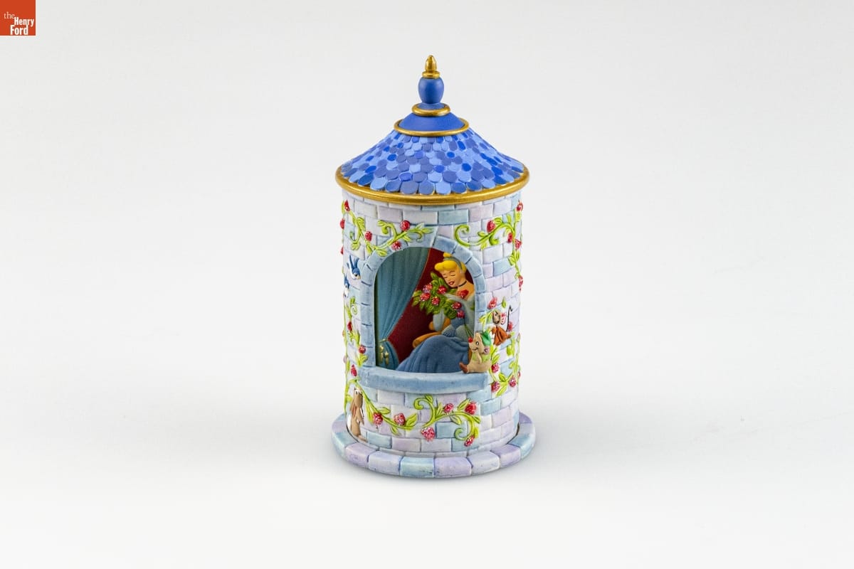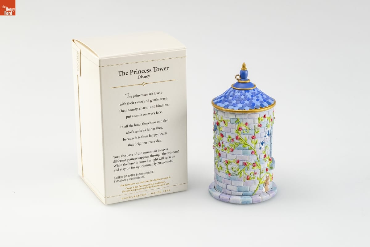 The Princess Tower / Disney / The princesses are lovely / with their sweet and gentle grace. / Their beauty, charm, and kindness / put a smile on every face. / In all the land, there's no one else / who's quite as fair as they, / because it is their happy hearts / that brighten every day. / Turn the base of the ornament to see a / different princess appear through the window! / When the base is turned a light will turn on / and stay on for approximately 20 seconds. / BATTERY-OPERATED. Batteries included. / Instructions printed inside box. / For decorative use only. Not for children under 8. / Concu a des fins decoratives seulement. / Ne convient pas aux enfants de moins de 8 ans. / HANDCRAFTED - DATED 2006