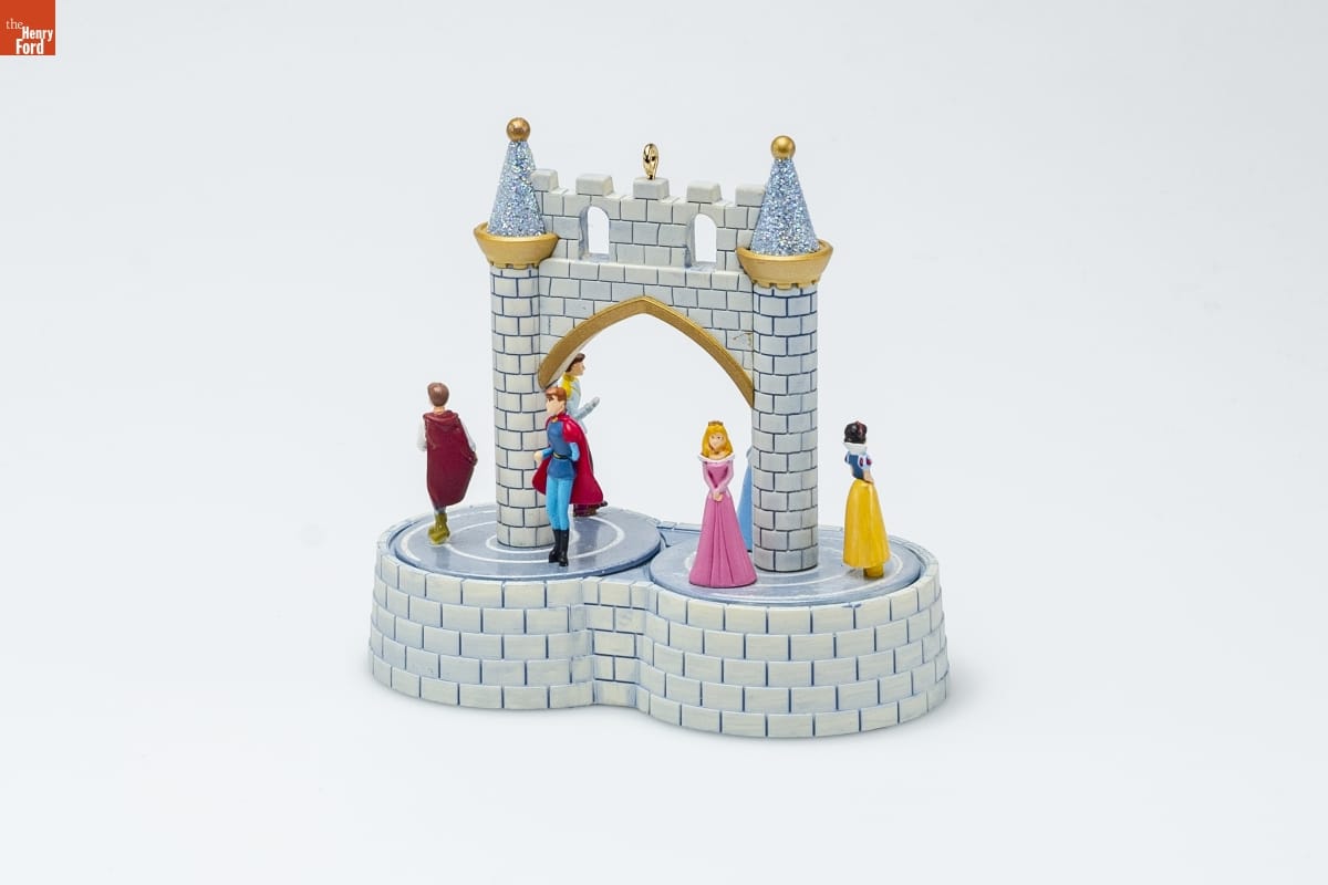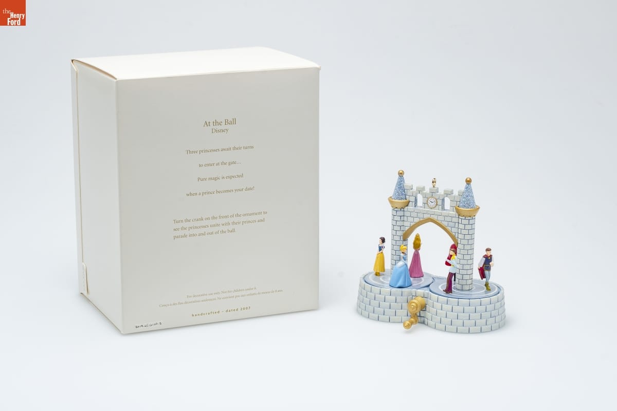 At the Ball / Disney / Three princesses await their turns / to enter at the gate... / Pure magic is expected / when a prince becomes your date! / Turn the crank on the front of the ornament to / see the princesses unite with their princes and / parade into and out of the ball. / For decorative use only. Not for children under 8. / Concu a des fins decoratives seulement. Ne convient pas aux enfants de moins de 8 ans. / handcrafted - dated 2007