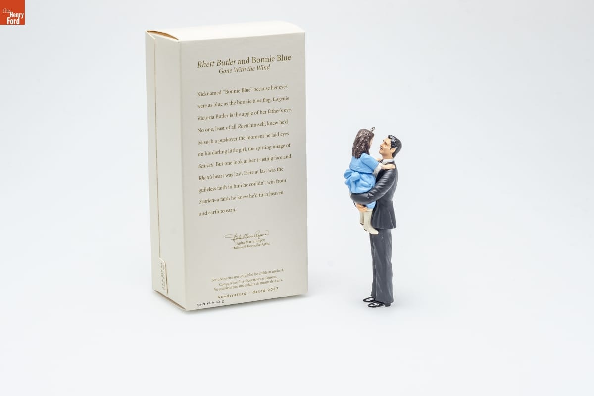 Rhett Butler and Bonnie Blue / Gone With the Wind / Nicknamed "Bonnie Blue" because her eyes / were as blue as the bonnie blue flag, Eugenie / Victoria Butler is the apple of her father's eye. / No one, least of all Rhett himself, knew he'd / be such a pushover the moment he laid eyes / on his darling little girl, the spitting image of / Scarlett. But one look at her trusting face and / Rhett's heart was lost. Here at last was the / guileless faith in him that he couldn't win from / Scarlett--a faith he knew he'd turn heaven / and earth to earn. / Anita Marra Rogers / Hallmark Keepsake Artist / For decorative use only. Not for children under 8. / Concu a des fins decoratives seulement. / Ne convient pas aux enfants de moins de 8 ans. / handcrafted - dated 2007