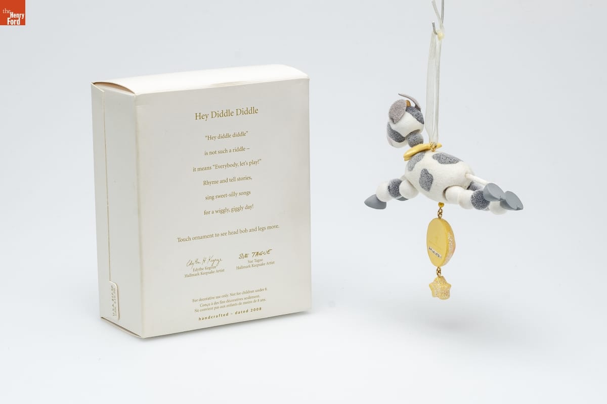 Hey Diddle Diddle / "Hey diddle diddle" / is not such a riddle -- / it means "Everybody, let's play!" / Rhyme and tell stories, / sing sweet-silly songs / for a wiggly, giggly day! / Touch ornament to see head bob and legs move. / Edythe Kegrize / Hallmark Keepsake Artist / Sue Tague / Hallmark Keepsake Artist / For decorative use only. Not for children under 8. / Concu a des fins decoratives seulement. / Ne convient pas aux enfants de moins de 8 ans. / handcrafted - dated 2008