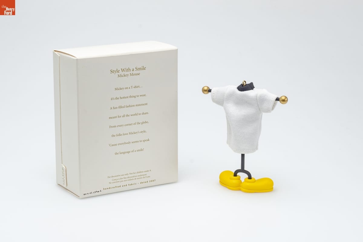 Style With a Smile / Mickey Mouse / Mickey on a T-shirt... / it's the hottest thing to wear. / A fun-filled fashion statement / meant for all the world to share. / From every corner of the globe, / the folks love Mickey's style, / 'Cause everybody seems to speak / the language of a smile! / For decorative use only. Not for children under 8. / Concu a des fins decoratives seulement. / Ne convient pas aux enfants de moins de 8 ans. / handcrafted and fabric - dated 2007
