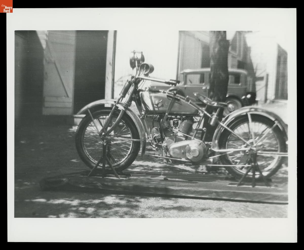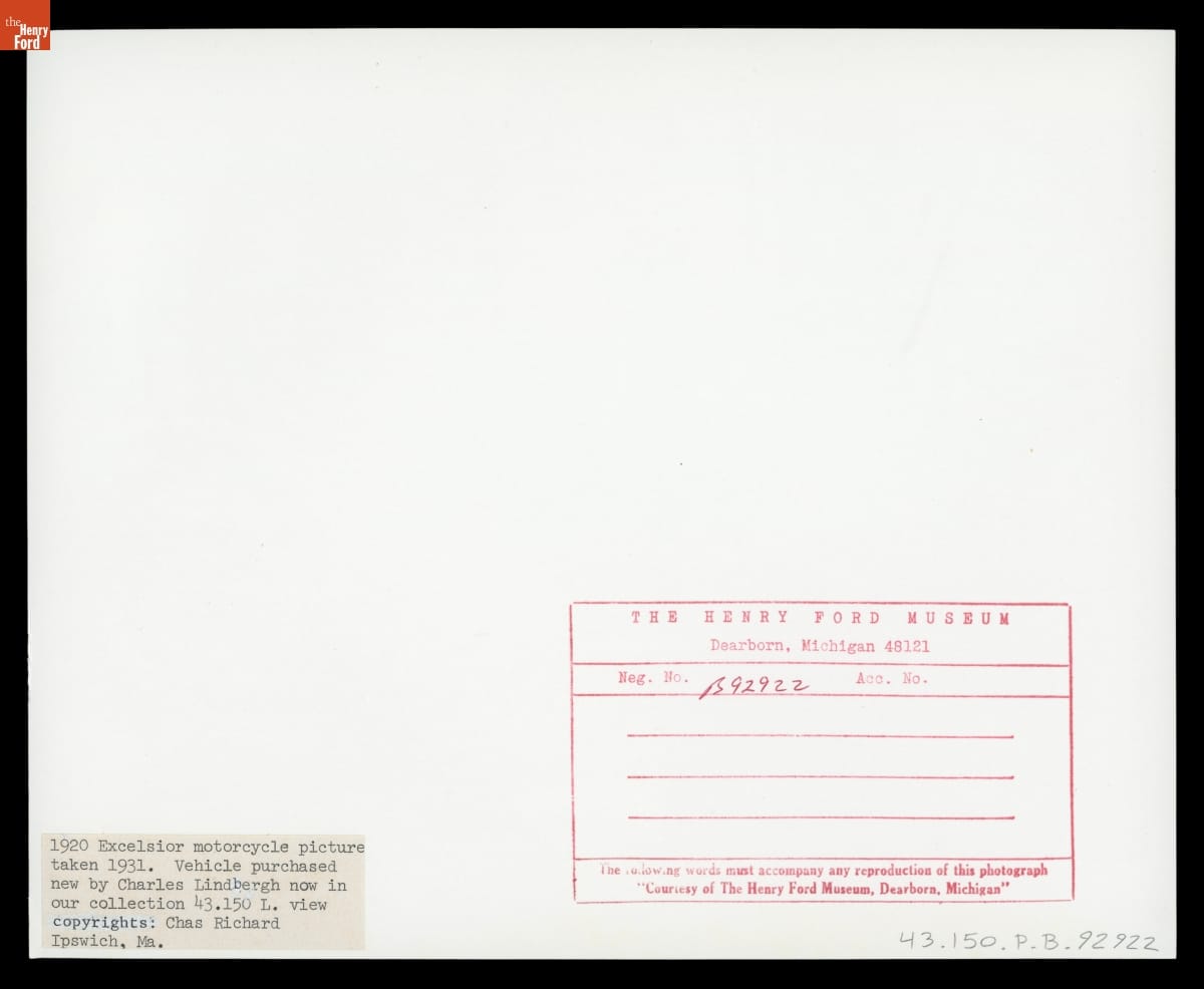 Charles Lindbergh purchased this Excelsior motorcycle in his hometown of Little Falls, Minnesota, in 1920. He used it while attending the University of Wisconsin, and he rode it on trips to Kentucky, Florida, and Nebraska as well. Lindbergh's much-used motorcycle was sandblasted and varnished in 1931. Lindbergh gifted his Excelsior to The Henry Ford in 1943.