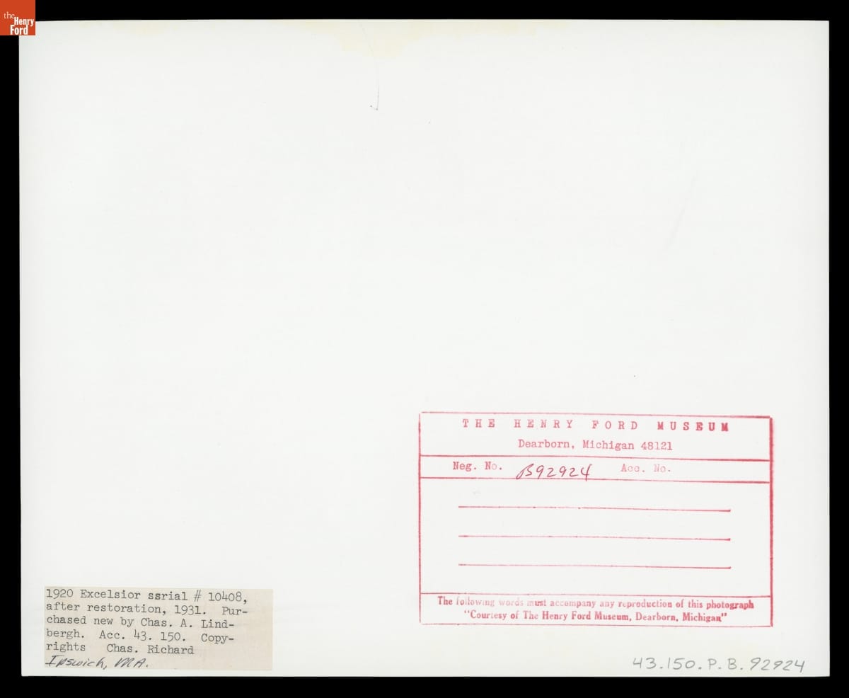 Charles Lindbergh purchased this Excelsior motorcycle in his hometown of Little Falls, Minnesota, in 1920. He used it while attending the University of Wisconsin, and he rode it on trips to Kentucky, Florida, and Nebraska as well. Lindbergh's much-used motorcycle was sandblasted and varnished in 1931. Lindbergh gifted his Excelsior to The Henry Ford in 1943.