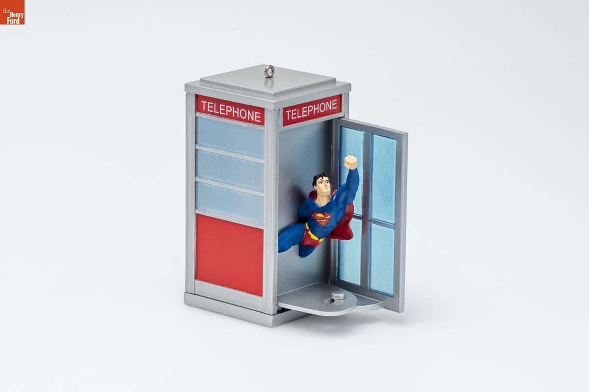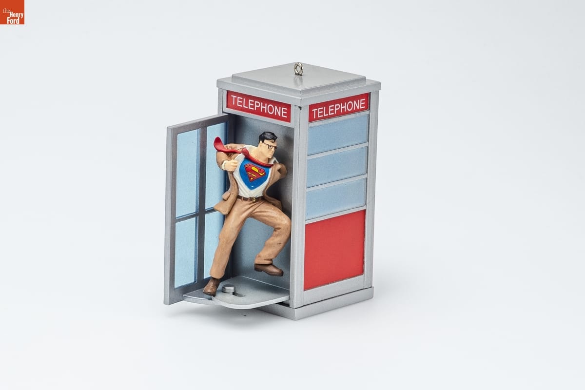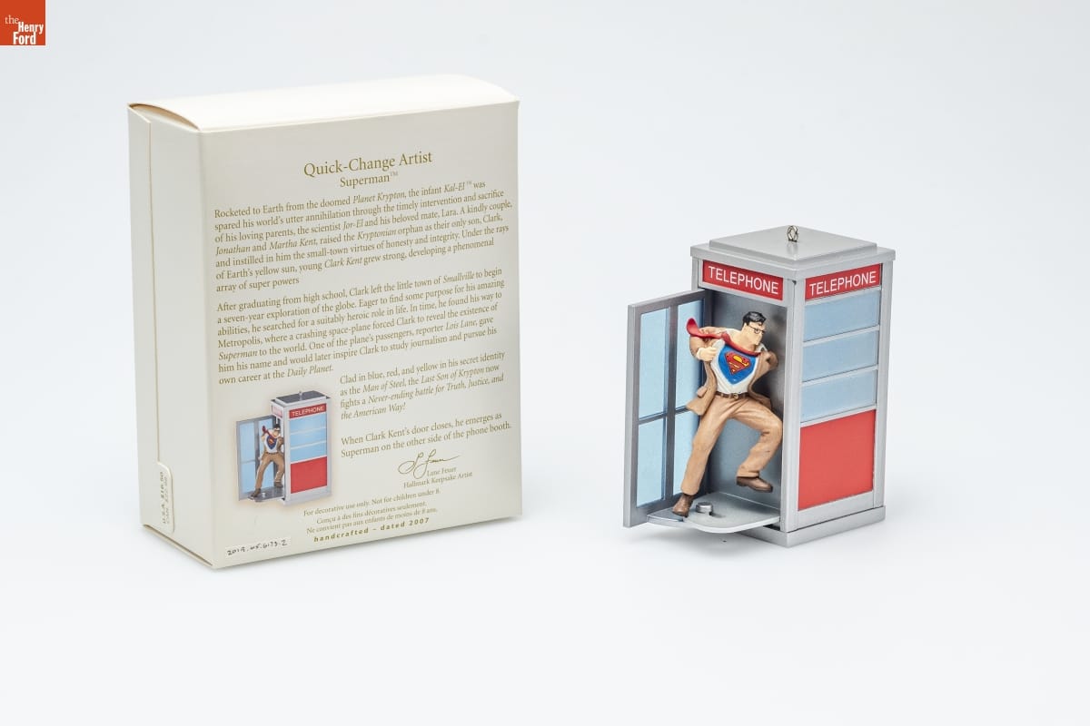 Quick-Change Artist / Superman [TM] / Rocketed to Earth from the doomed Planet Krypton, the infant Kal-El [TM] was / spared his world's utter annihilation through the timely intervention and sacrifice, / of his loving parents, the scientist Jor-El and his beloved mate, Lara. A kindly couple / Jonathon and Marion Kent, raised the Kryptonian orphan as their only son, Clark, / and instilled in him the small-town virtues of honesty and integrity. Under the rays / of Earth's yellow sun, young Clark Kent grew strong, developing a phenomenal / array of super powers. / After graduating from high school, Clark left the little town of Smallville to begin / a seven-year exploration of the globe. Eager to find some purpose for his amazing / abilities, he searched for a suitably heroic role in life. In time, he found his way to / Metropolis, where a crashing space-plane forced Clark to reveal the existence of / Superman to the world. One of the plane's passengers, reporter Lois Lane, gave / him his name and would later inspire Clark to study journalism and pursue his / own career at The Daily Planet. / Clad in blue, red, and yellow in his secret identity / as the Man of Steel, the Last Son of Krypton now / fights a Never-ending battle for Truth, Justice, and / the American Way! / When Clark Kent's door closes, he emerges as / Superman on the other side of the phone booth. / Lane Feuer / Hallmark Keepsake Artist / For decorative use only. Not for children under 8. / Concu a des fins decoratives seulement. / Ne convient pas aux enfants de moins de 8 ans. / handcrafted - dated 2007