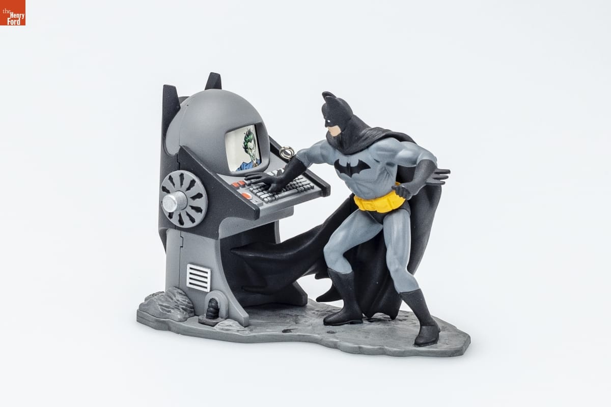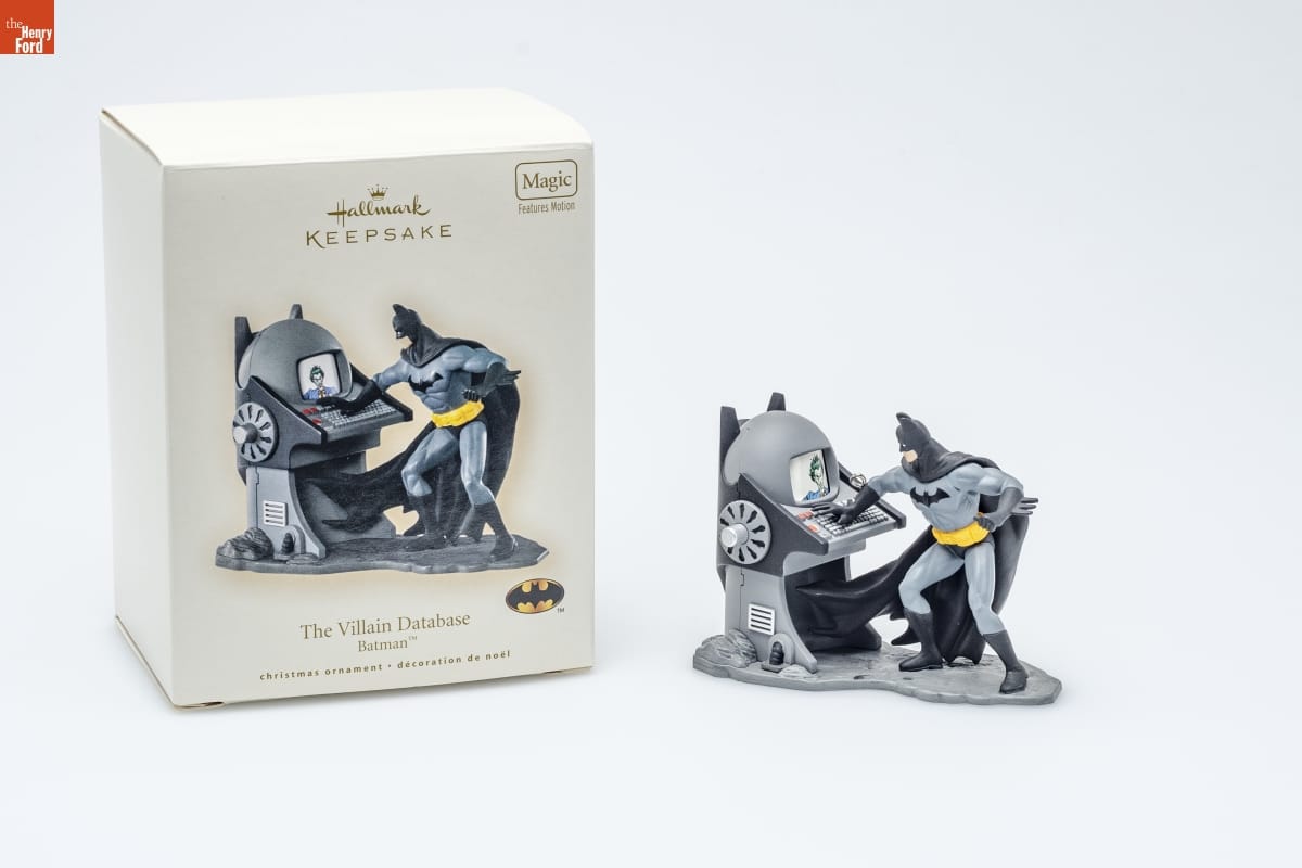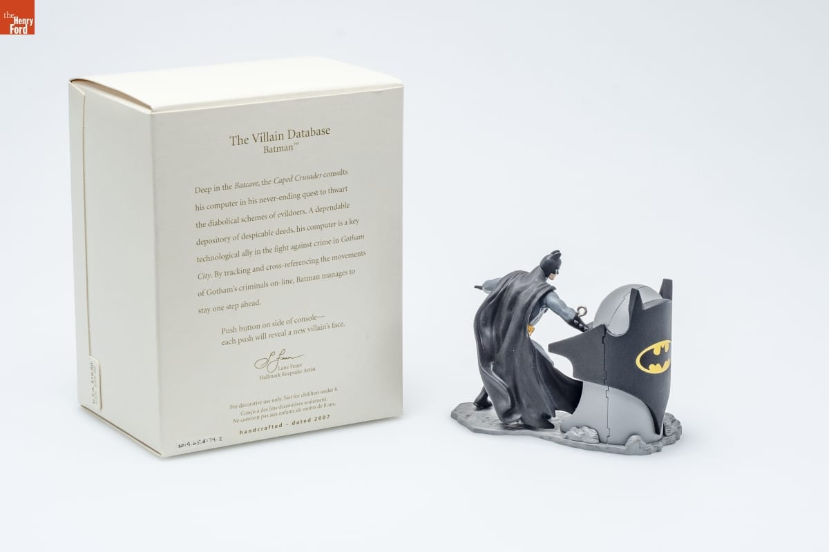 The Villain Database / Batman [TM] / Deep in the Batcave, the Caped Crusader consults / his computer in his never-ending quest to thwart / the diabolical schemes of evildoers. A dependable / depository of despicable deeds, his computer is a key / technological ally in the fight against crime in Gotham / City. By tracking and cross-referencing the movements / of Gotham's criminals on-line, Batman manages to / stay one step ahead. / Push button on side of console-- / each push will reveal a new villain's face. / Lane Feuer / Hallmark Keepsake Artist / For decorative use only. Not for children under 8. / Concu a des fins decoratives seulement. / Ne convient pas aux enfants de moins de 8 ans. / handcrafted - dated 2007