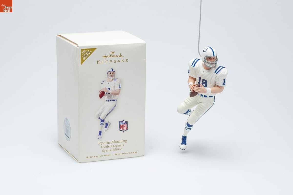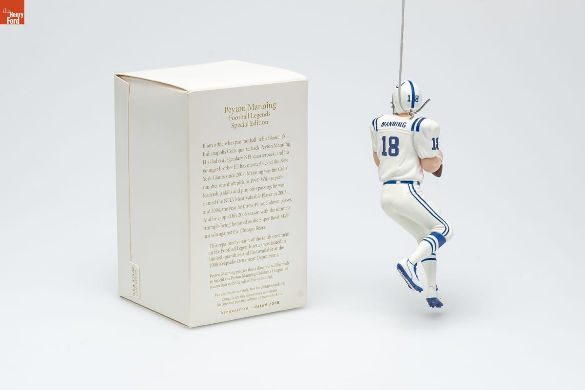 Peyton Manning / Football Legends / Special Edition / If any athlete has pro football in his blood, it's / Indianapolis Colts quarterback Peyton Manning. / His dad is a legendary NFL quarterback, and his / younger brother Eli has quarterbacked the New / York Giants since 2004. Manning was the Colts' / number one draft pick in 1998. With superb / leadership skills and pinpoint passing, he was / named the NFL's Most Valuable Player in 2003 / and 2004, the year he threw 49 touchdown passes. / And he capped his 2006 season with the ultimate / triumph--being honored as the Super Bowl MVP / in a win against the Chicago Bears. / This repainted version of the tenth ornament / in the Football Legends series was issued in / limited quantities and first available at the / 2008 Keepsake Ornament Debut event. / Peyton Manning pledges that a donation will be made / to benefit the Peyton Manning Children's Hospital in / connection with the sale of this ornament. / For decorative use only. Not for children under 8. / Concu a des fins decoratives seulement. / Ne convient pas aux enfants de moins de 8 ans. / handcrafted - dated 2008