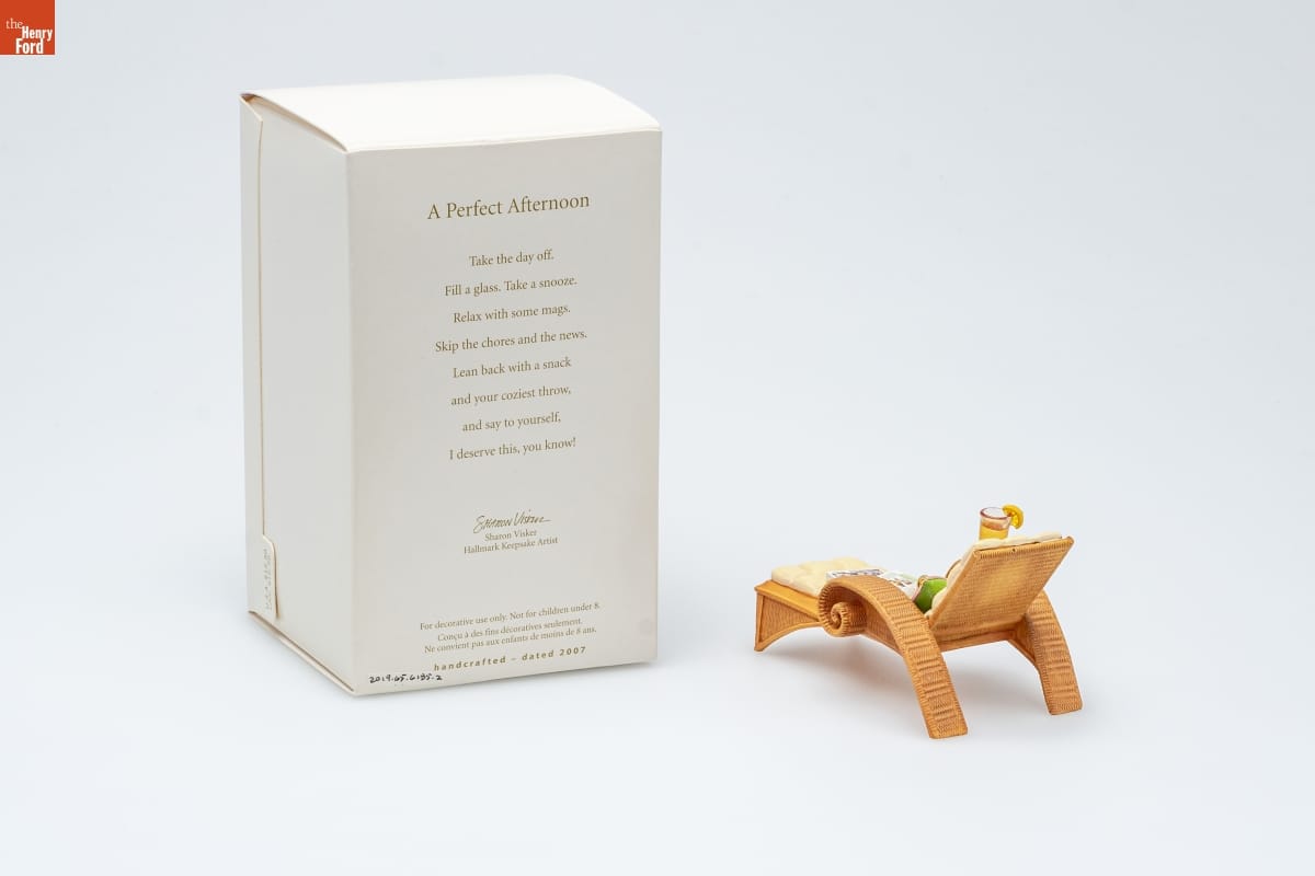 A Perfect Afternoon / Take the day off. / Fill a glass. Take a snooze. / Relax with some mags. / Skip the chores and the news. / Lean back with a snack / and your coziest throw, / and say to yourself, / I deserve this, you know! / Sharon Visker / Hallmark Keepsake Artist / For decorative use only. Not for children under 8. / Concu a des fins decoratives seulement. / Ne convient pas aux enfants de moins de 8 ans. / handcrafted - dated 2007