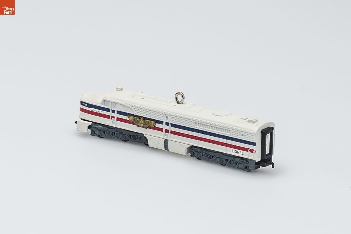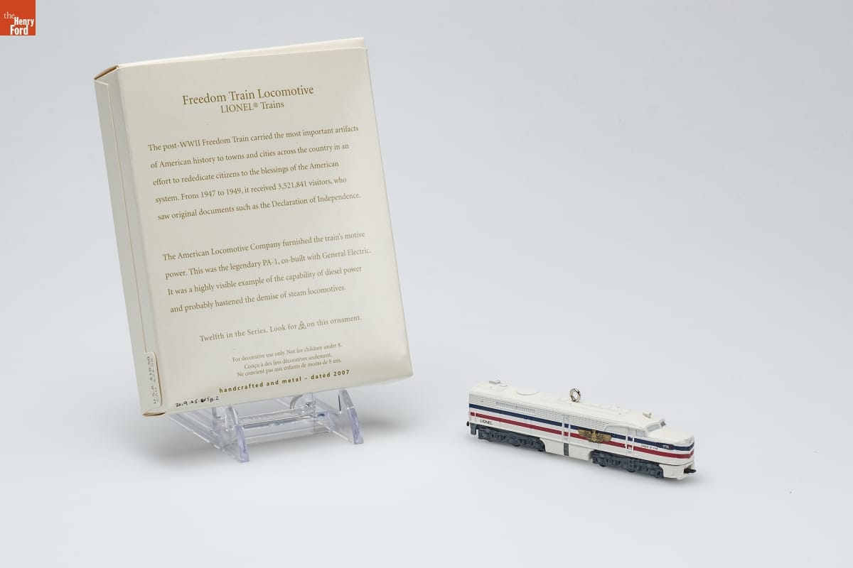 Freedom Train Locomotive / LIONEL [R] Trains / The post-WWII Freedom Train carried the most important artifacts / of American history to towns and cities across the country in an / effort to rededicate citizens to the blessings of the American / system. From 1947 to 1949, it received 3,521,841 visitors, who / saw original documents such as the Declaration of Independence. / The American Locomotive Company furnished the train's motive / power. This was the legendary PA-1, co-built with General Electric. / It was a highly visible example of the capability of diesel power / and probably hastened the demise of steam locomotives. / Twelfth in the Series. Look for 12 on this ornament. / For decorative use only. Not for children under 8. / Concu a des fins decoratives seulement. / Ne convient pas aux enfants de moins de 8 ans. / handcrafted and metal - dated 2007