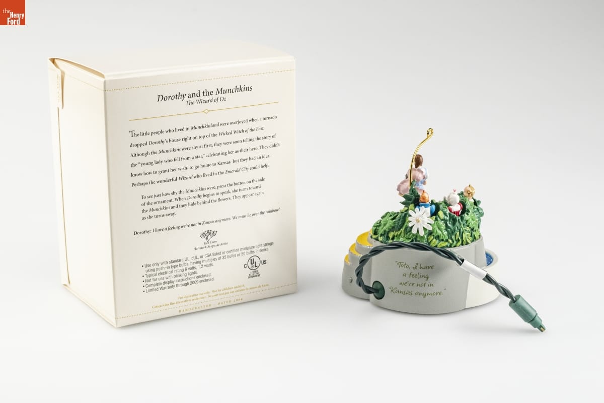 Dorothy and the Munchkins / The Wizard of Oz / The little people who lived in Munchkinland were overjoyed when a tornado / dropped Dorothy's house right on top of the Wicked Witch of the East. / Although the Munchkins were shy at first, they were soon telling the story of / the "young lady who fell from a star," celebrating her as their hero. They didn't / know how to grant her wish--to go home to Kansas--but they had an idea. / Perhaps the wonderful Wizard who lived in the Emerald City could help. / To see just how shy the Munchkins were, press the button on the side / of the ornament. When Dorothy begins to speak, she turns toward / the Munchkins and they hide behind the flower. They appear again / as she turns away. / Dorothy: I have a feeling we're not in Kansas anymore. We must be over the rainbow! / Ken Crow / Hallmark Keepsake Artist / Use only with standard UL, cUL, or CSA listed or certified miniature light strings / using push-in type bulbs, having multiple of 35 bulbs or 50 bulbs in series. / Typical electrical raging 6 volts, 1.2 watts. / Not for use with blinking lights. / Complete display instructions enclosed. / Linited Warranty through 2009 enclosed. / For decorative use only. Not for children under 8. / Concu a des fins decoratives seulement. Ne convient pas aux enfants de moins de 8 ans. / HANDCRAFTED - DATED 2006