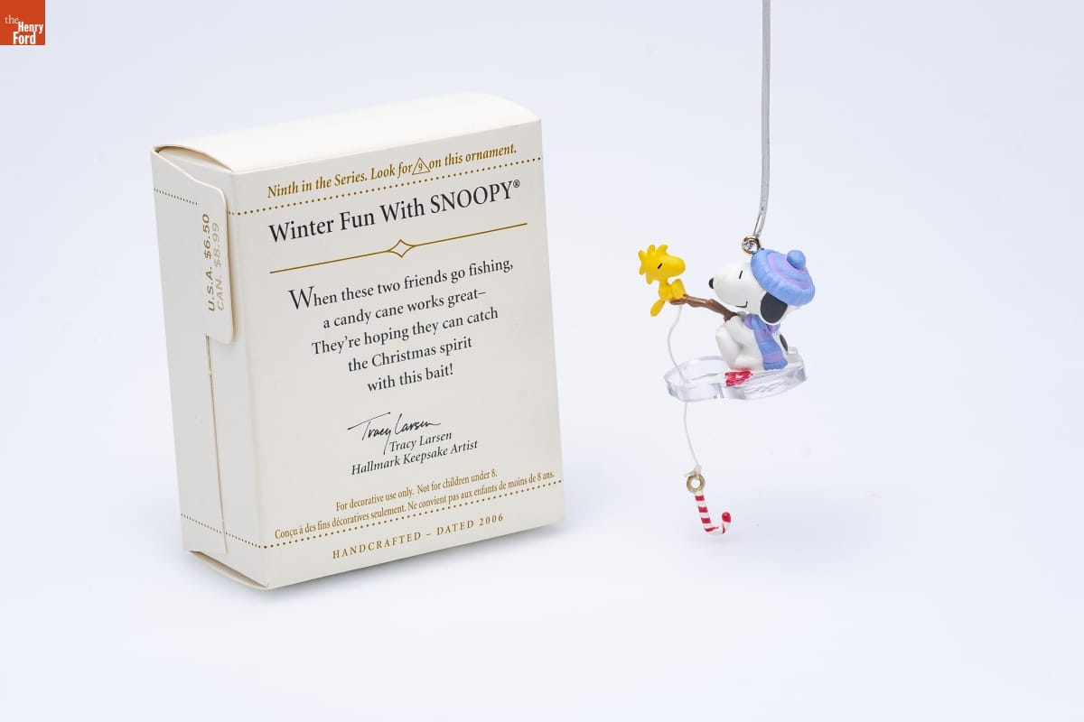 Ninth in the Series. Look for 9 on this ornament. / Winter Fun With SNOOPY(R) / When these two friends go fishing, / a candy cane works great-- / They're hoping they can catch / the Christmas spirit / with this bait! / Tracy Larsen / Hallmark Keepsake Artist / For decorative use only. Not for children under 8. / Concu a des fins decoratives seulement. Ne convient pas aux enfants de moins de 8 ans. / HANDCRAFTED - DATED 2006
