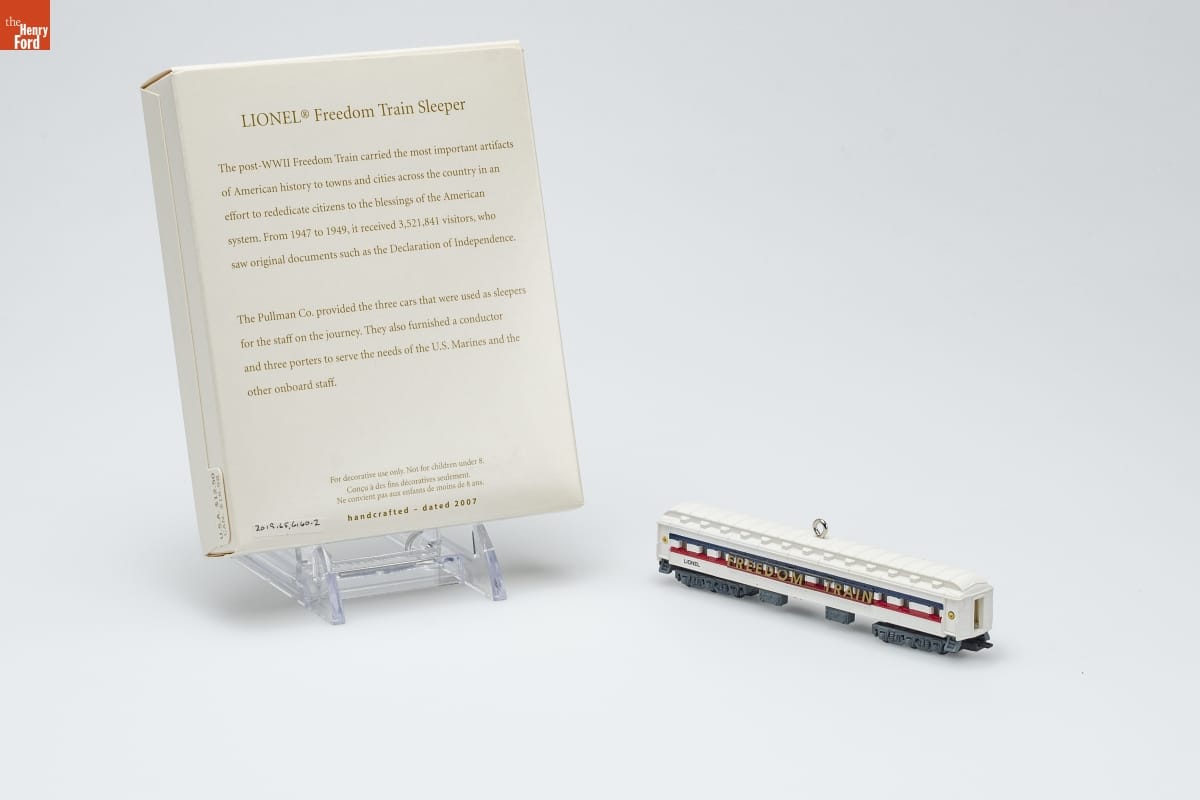 LIONEL [R] Freedom Train Sleeper / The post-WWII Freedom Train carried the most important artifacts / of American history to towns and cities across the country in an / effort to rededicate citizens to the blessings of the American / system. From 1947 to 1949, it received 3,521,841 visitors, who / saw original documents such as the Declaration of Independence. / The Pullman Co. provided the three cars that were used as sleepers / for the staff on the journey. They also furnished a conductor / and three porters to serve the needs of the U.S. Marines and the / other onboard staff. / For decorative use only. Not for children under 8. / Concu a des fins decoratives seulement. / Ne convient pas aux enfants de moins de 8 ans. / handcrafted - dated 2007