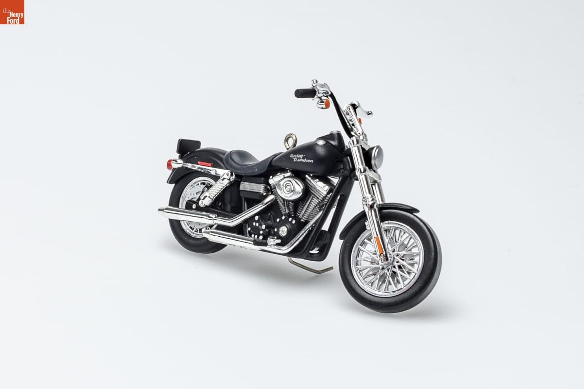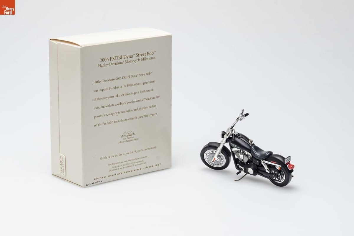 2006 FXDBI Dyna [TM] Street Bob [TM] / Harley-Davidson [R] Motorcycle Milestones / Harley-Davidson's 2006 FXCBI Dyna [TM] Street Bob [TM] / was inspired by riders in the 1950s who stripped some / of the shiny parts off their bikes to get a bold custom / look. But with its cool black powder-coated Twin Cam 88 [R] / powertrain, 6-speed transmission, and chunky emblem / on the Fat Bob [TM] tank, this machine is pure 21st century. / Don Palmiter / Hallmark Keepsake Artist / Ninth in the Series. Look for 9 on this ornament. / For decorative use only. Not for children under 8. / Concu a des fins decoratives seulement. / Ne convient pas aux enfants de moins de 8 ans. / die-cast metal and handcrafted - dated 2007