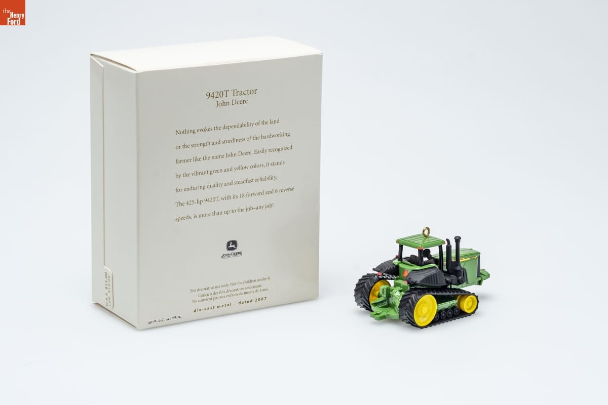 9420T Tractor / John Deere / Nothing evokes the dependability of the land / or the strength and sturdiness of the hardworking / farmer like the name John Deere. Easily recognized / by the vibrant green and yellow colors, it stands / for enduring quality and steadfast reliability. / The 425-hp 9420T, with its 18 forward and 6 reverse / speeds, is more than up to the job--any job! / [John Deere logo] / JOHN DEERE / LICENSED PRODUCT / For decorative use only. Not for children under 8. / Concu a des fins decoratives seulement. / Ne convient pas aux enfants de moins de 8 ans. / die-cast metal - dated 2007