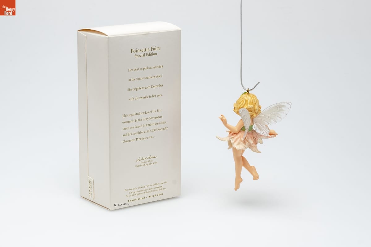 Poinsettia Fairy / Special Edition / Her skirt as pink as morning / in the sunny southern skies, / She brightens each December / with the twinkle in her eyes. / This repainted version of the first / ornament in the Fairy Messengers / series was issued in limited quantities / and first available at the 2007 Keepsake / Ornament Premiere event. / Kristina Kline / Hallmark Keepsake Artist / For decorative use only. Not for children under 8. / Concu a des fins decoratives seulement. / Ne convient pas aux enfants de moins de 8 ans. / handcrafted - dated 2007
