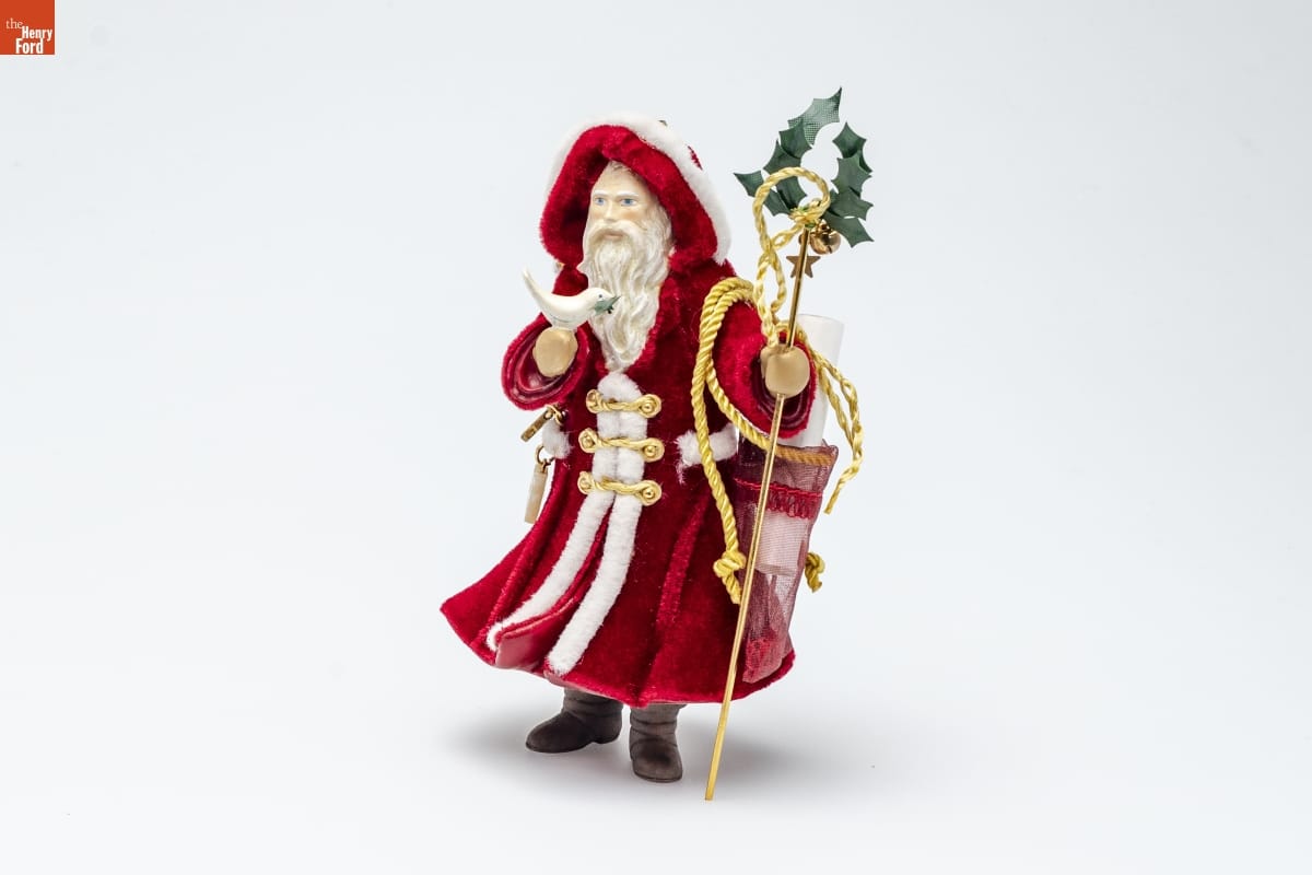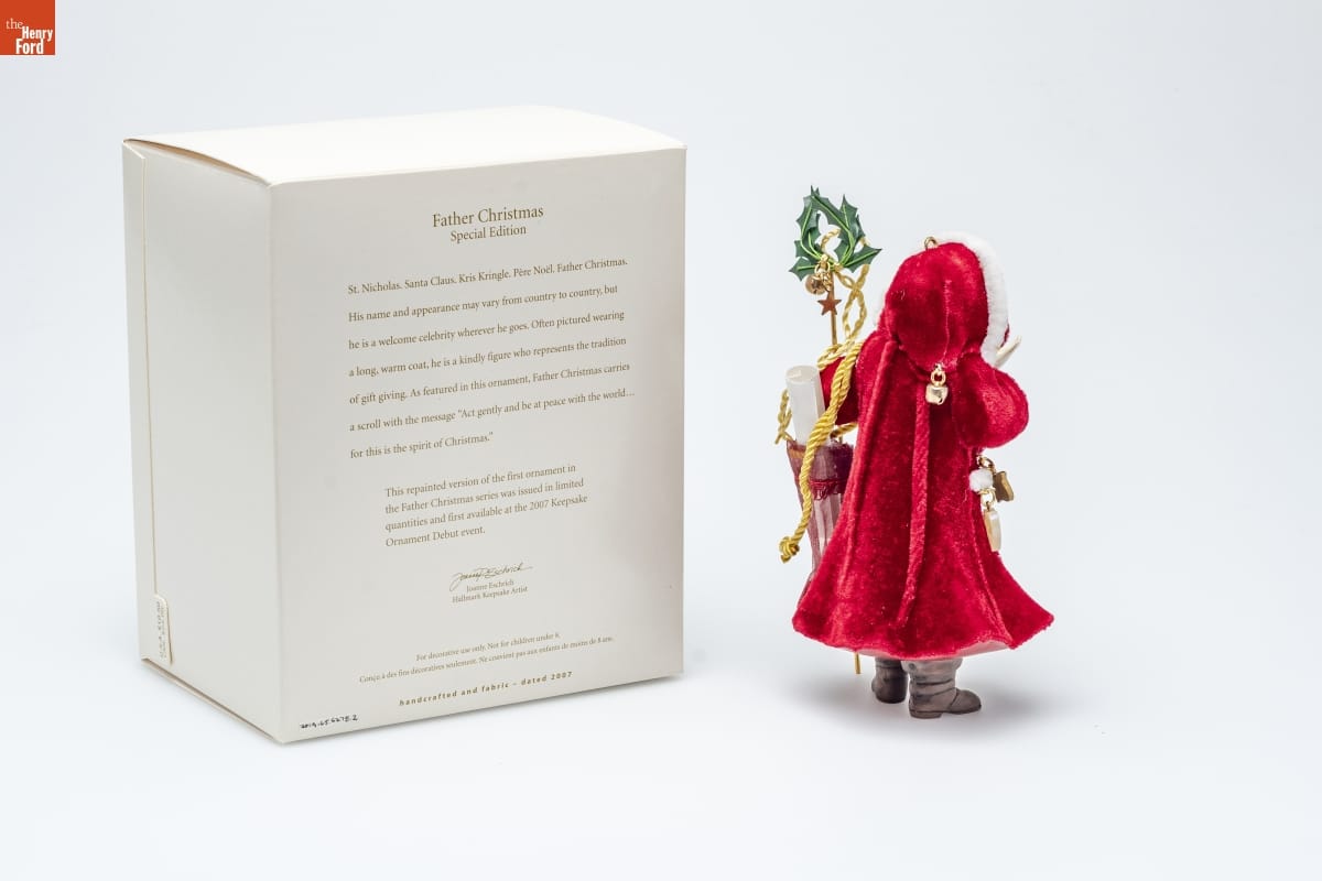 Father Christmas / Special Edition / St. Nicholas, Santa Claus, Kris Kringle, Pere Noel, Father Christmas. / His name and appearance may vary from country to country, but / he is a welcome celebrity wherever he goes. Often pictured wearing / a long, warm coat, he is a kindly figure who represents the tradition / of gift giving. As featured in this ornament, Father Christmas carries / a scroll with the message "Act gently and be at peace with the world... / for this is the spirit of Christmas." / This repainted version of the first ornament in / the Father Christmas series was issued in limited / quantities and first available at the 2007 Keepsake / Ornament Debut event. / Joanne Eschrich / Hallmark Keepsake Artist / For decorative use only. Not for children under 8. / Concu a des fins decoratives seulement. Ne convient pas aux enfants de moins de 8 ans. / handcrafted and fabric - dated 2007
