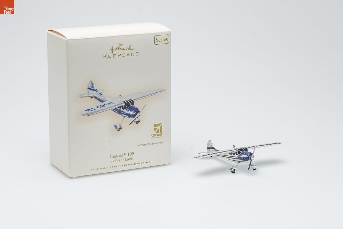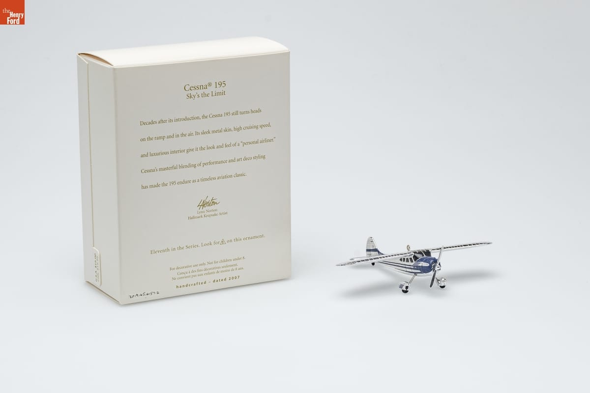 Cessna [R] 195 / Sky's the Limit / Decades after its introduction, the Cessna 195 still turns heads / on the ramp and in the air. Its sleek metal skin, high cruising speed, / and luxurious interior give it the look and feel of a "personal airliner." / Cessna's masterful blending of performance and art deco styling / has made the 195 endure as a timeless aviation classic. / Lynn Norton / Hallmark Keepsake Artist / Eleventh in the Series. Look for 11 on this ornament. / For decorative use only. Not for children under 8. / Concu a des fins decoratives seulement. / Ne convient pas aux enfants de moins de 8 ans. / handcrafted - dated 2007