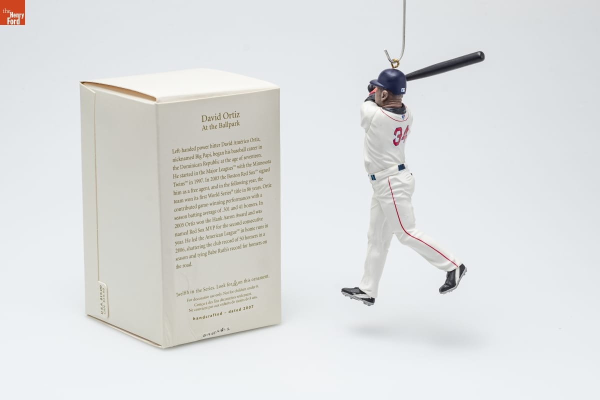 David Ortiz / At the Ballpark / Left-handed power hitter David Americo Ortiz, / nicknamed Big Papi, began his baseball career in / the Dominican Republic at the age of seventeen. / He started in the Major Leagues [TM] with the Minnesota / Twins [TM] in 1997. In 2003 the Boston Red Sox [TM] signed / him as a free agent, and in the following year, the / team won its first World Series [R] title in 86 years. Ortiz / contributed game-winning performances with a / season batting average of .301 and 41 homers. In / 2005 Ortiz won the Hank Aaron Award and was / named Red Sox MVP for the second consecutive / year. He led the American League [TM] in home runs in / 2006, shattering the club record of 50 homers in a / season and tying Babe Ruth's record for homers on / the road. / Twelfth in the Series. Look for 12 on this ornament. / For decorative use only. Not for children under 8. / Concu a des fins decoratives seulement. / Ne convient pas aux enfants de moins de 8 ans. / handcrafted - dated 2007