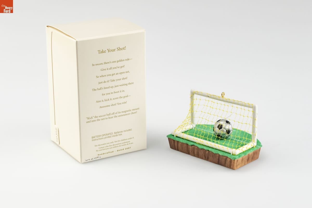 Take Your Shot! / In soccer, there's one golden rule-- / Give it all you've got! / So when you get an open net, / just do it! Take your shot! / The ball's lined up, just waiting there / for you to boot it in. / Aim it, kick it, score the goal-- / Awesome shot! You win! / "Kick" the soccer ball off of its magnetic mount / and into the net to hear the announcer cheer! / BATTERY-OPERATED. Batteries included. / Instructions printed inside box. / For decorative use only. Not for children under 8. / Concu a des fins decoratives seulement. / Ne convient pas aux enfants de moins de 8 ans. / handcrafted - dated 2007