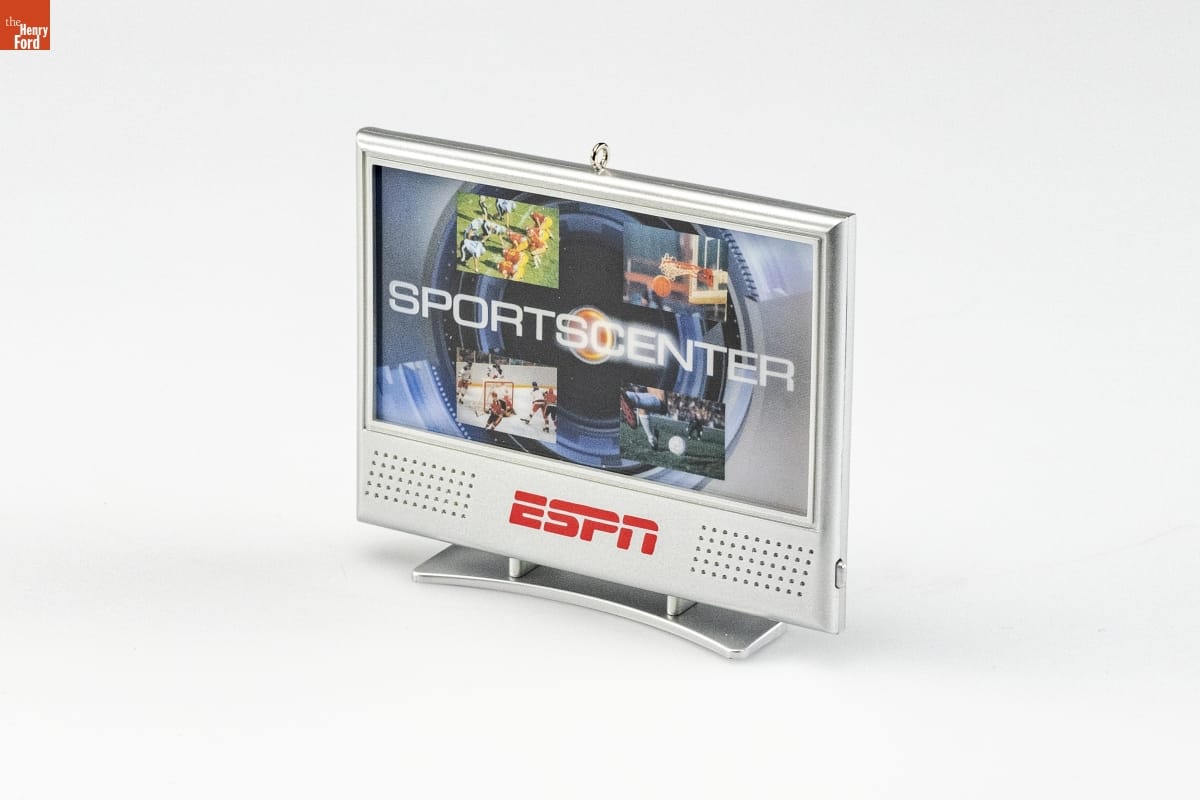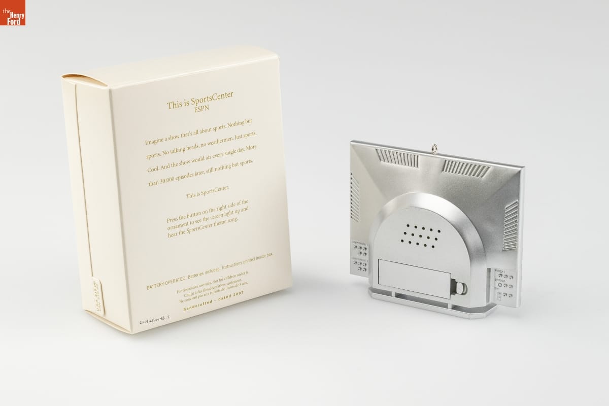 This is SportsCenter / ESPN / Imagine a show that's all about sports. Nothing but / sports. No talking heads, no weathermen. Just sports. / Cool. And the show would air every single day. More / than 30,000 episodes later, still nothing but sports. / This is SportsCenter. / Press the button on the right side of the / ornament to see the screen light up and / hear the SportsCenter theme song. / BATTERY-OPERATED. Batteries included. Instructions printed inside box. / For decorative use only. Not for children under 8. / Concu a des fins decoratives seulement. / Ne convient pas aux enfants de moins de 8 ans. / handcrafted - dated 2007