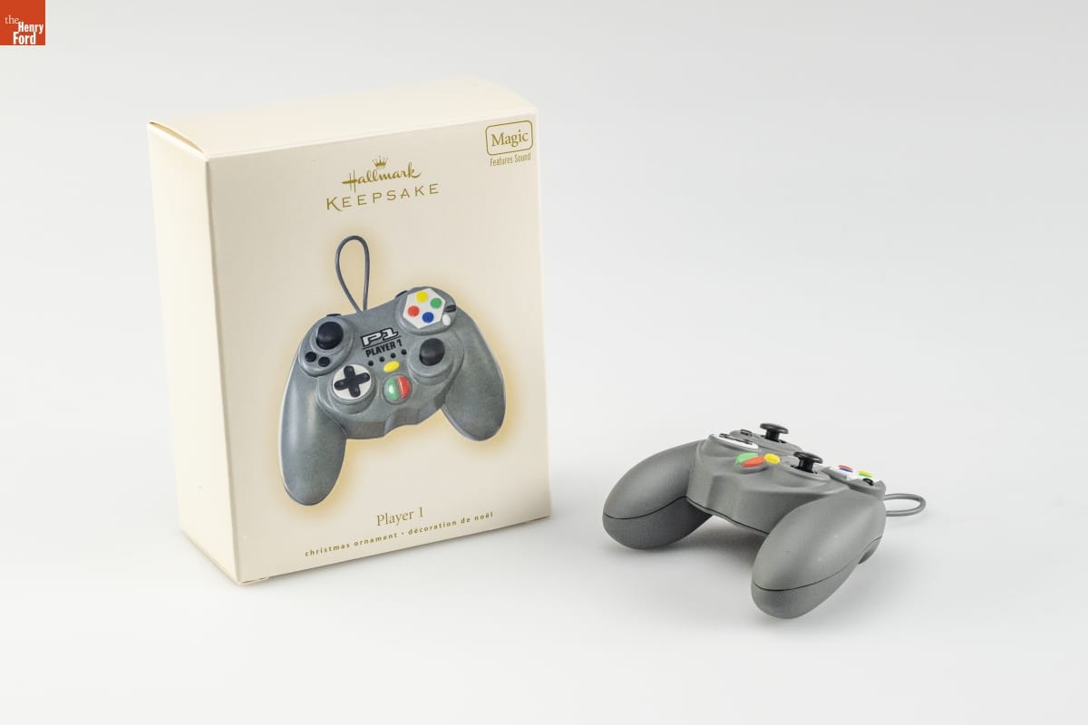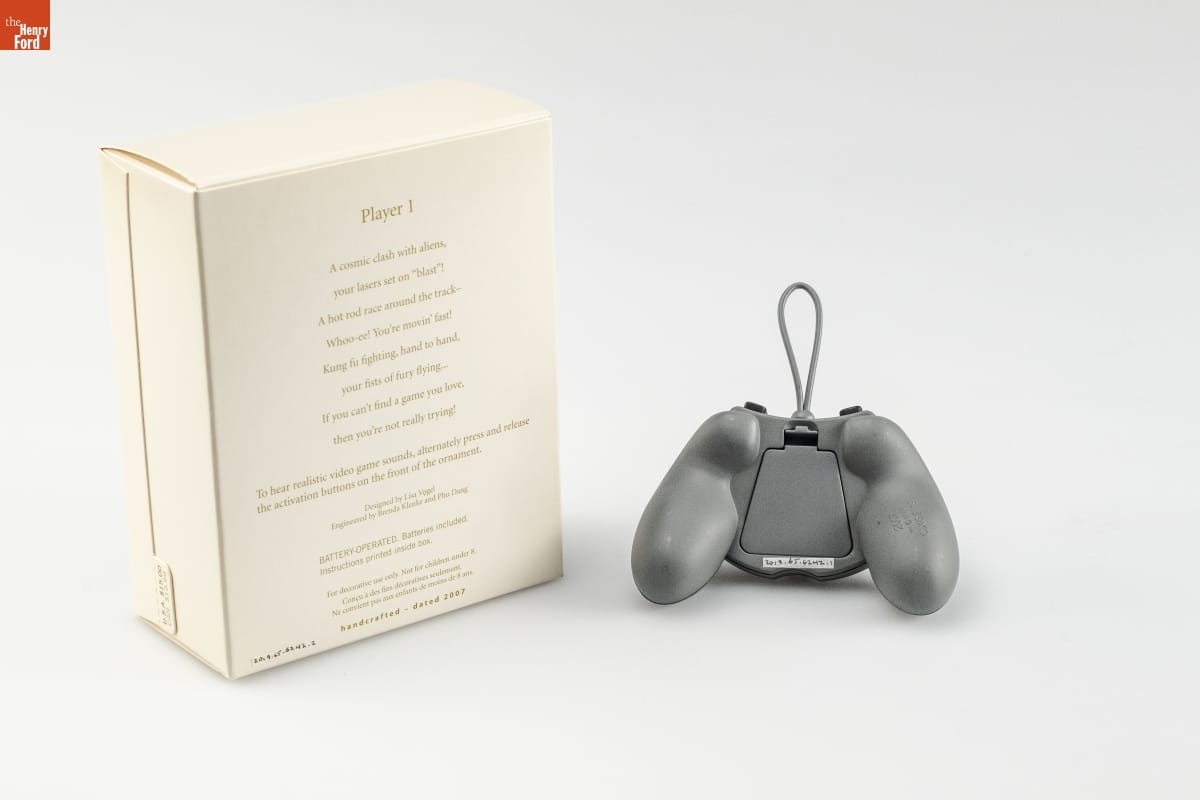 ornament: P1 / PLAYER 1 ornament, underside: 2007 / [TM] (C) HMK. / QXG2119 packaging, front: [TM] / Hallmark / KEEPSAKE / Magic / Features Sound / Player 1 / christmas ornament - decoration de noel packaging, back: Player 1 / A cosmic clash with aliens, / your lasers set on "blast"! / A hot rod race around the track-- / Whoo-ee! You're movin' fast! / Kung fu fighting, hand to hand, / your fists of fury flying... / If you can't find a game you love, / then you're not really trying! / To hear realistic video game sounds, alternatively press and release / the activation buttons on the front of the ornament. / Designed by Lisa Vogel / Engineered by Brenda Klenke and Phu Dang / BATTERY-OPERATED. Batteries included. / Instructions printed inside box. / For decorative use only. Not for children under 8. / Concu a des fins decoratives seulement. / Ne convient pas aux enfants de moins de 8 ans. / handcrafted - dated 2007 packaging, underside: (C) 2007 Hallmark Licensing, Inc. / Mfd. for/Fabrique pour Hallmark Cards, Inc. / Kansas City, MO 64141 / Made in China QSG2119